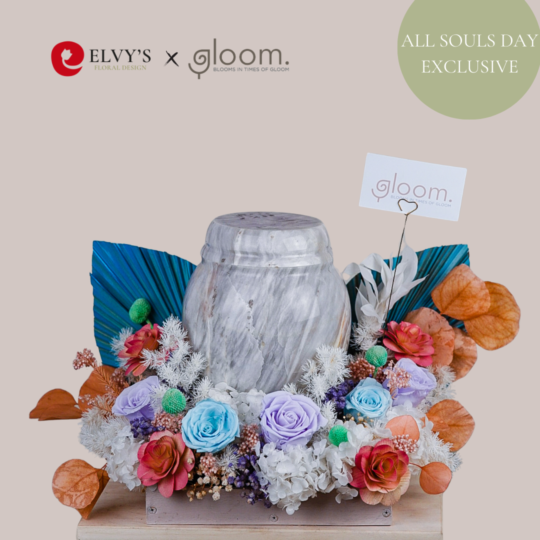 Mortal Soul is a vibrant and captivating arrangement that celebrates the beauty of life and memory. Featuring preserved roses in striking blue and lavender, combined with delicate white hydrangeas and bold orange accents, this design is both colorful and meaningful. The dried foliage and baby’s breath add texture and depth, making this arrangement a unique tribute for All Souls' Day. Urn not included.