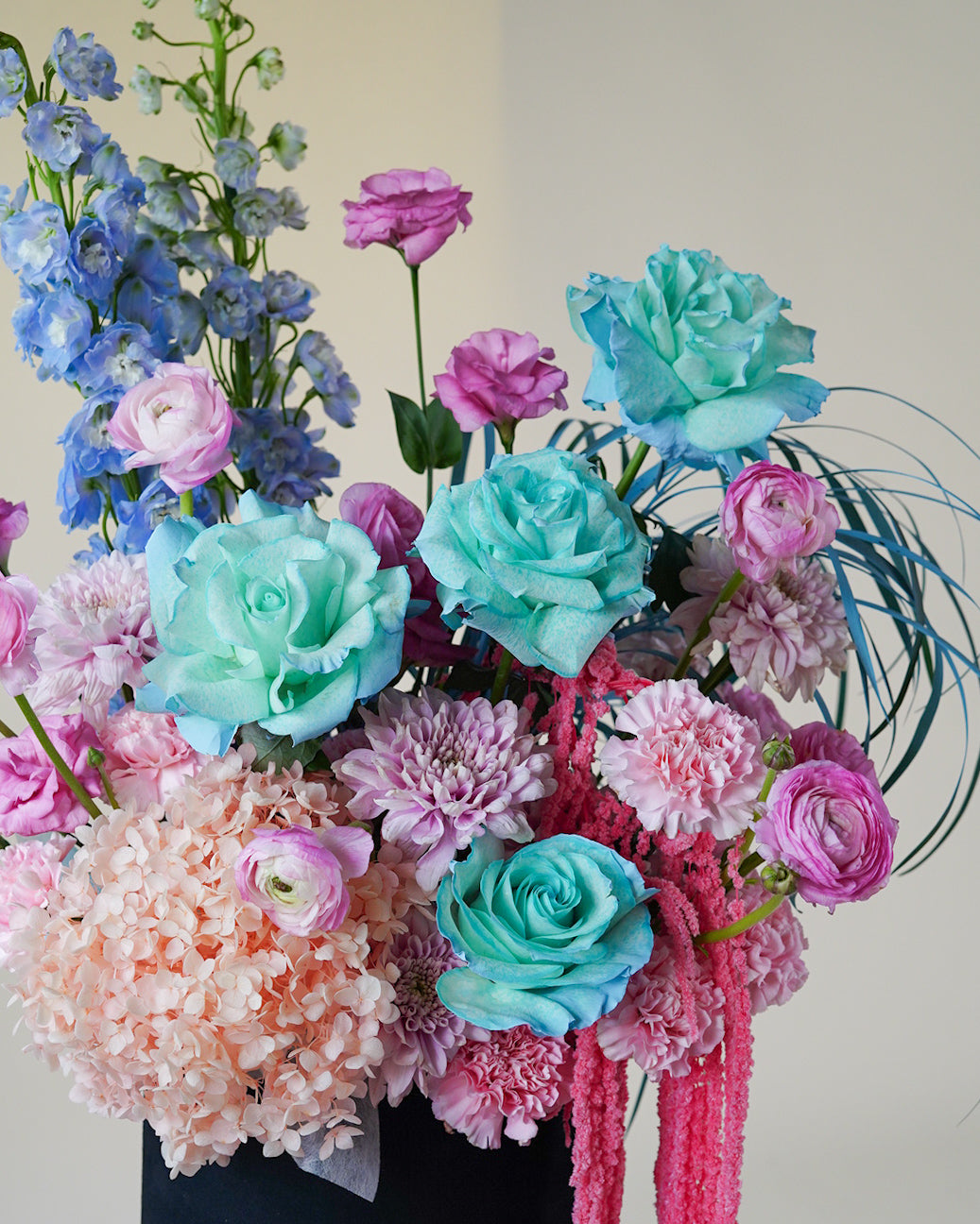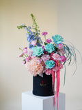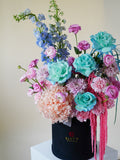 Assorted flowers such as Ecuadorian roses, Delphenium, rananculus, mums, hydrangeas, carnations, lisianthus, and amaranthus in Signature velvety giant bloombox.