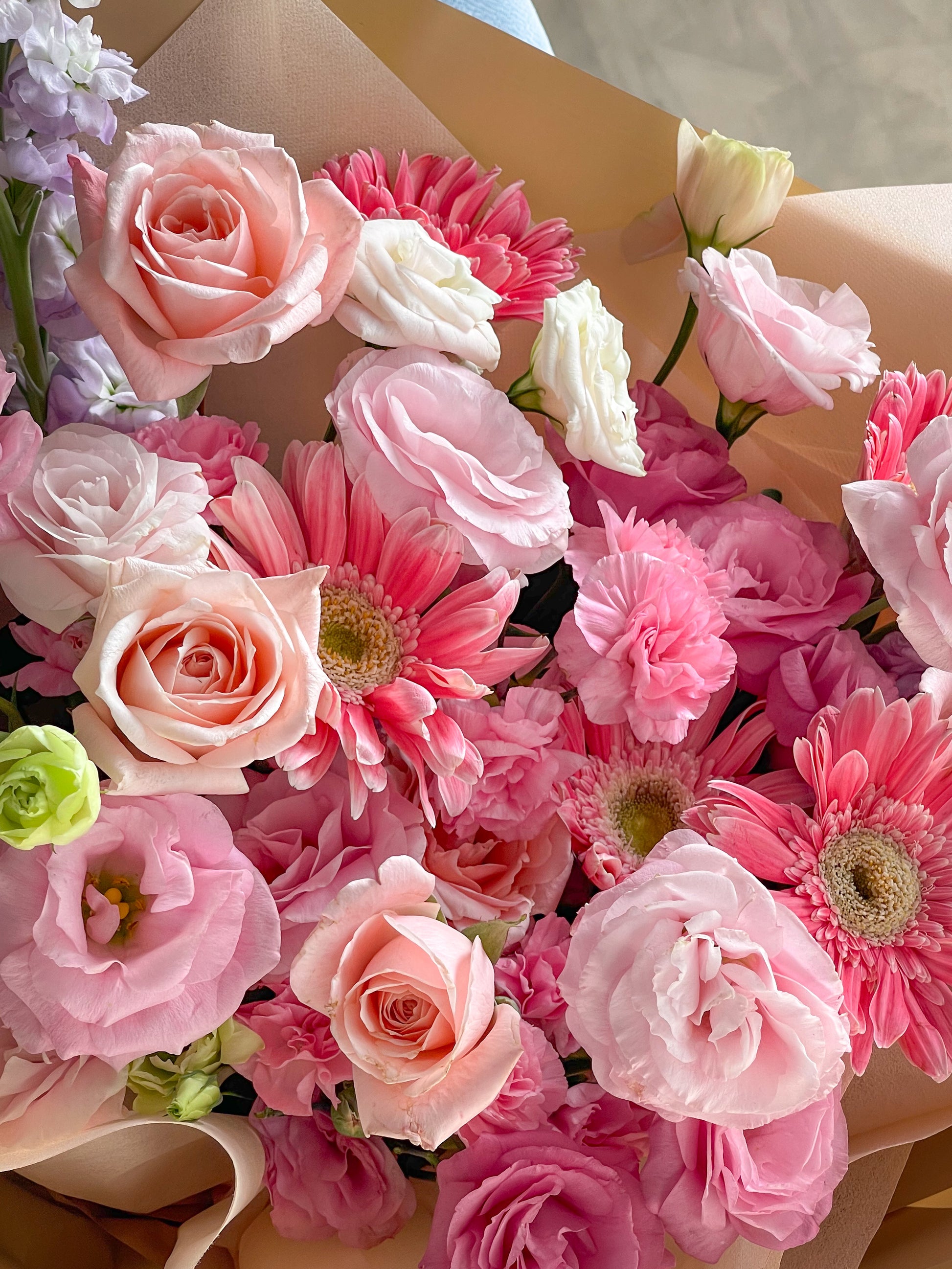 Main Flowers: Gerbera, Lisianthus, Roses, Carnations, Matthiola