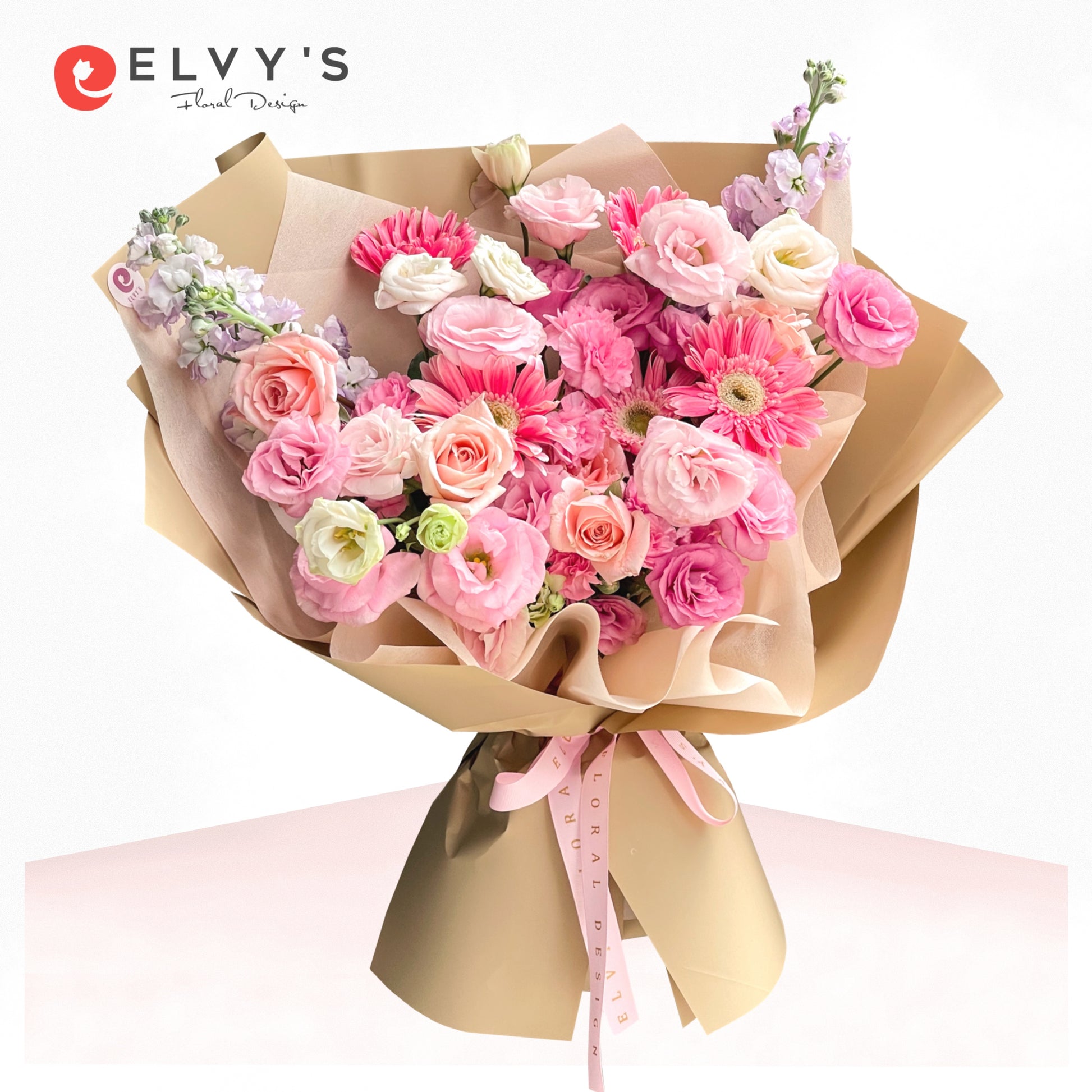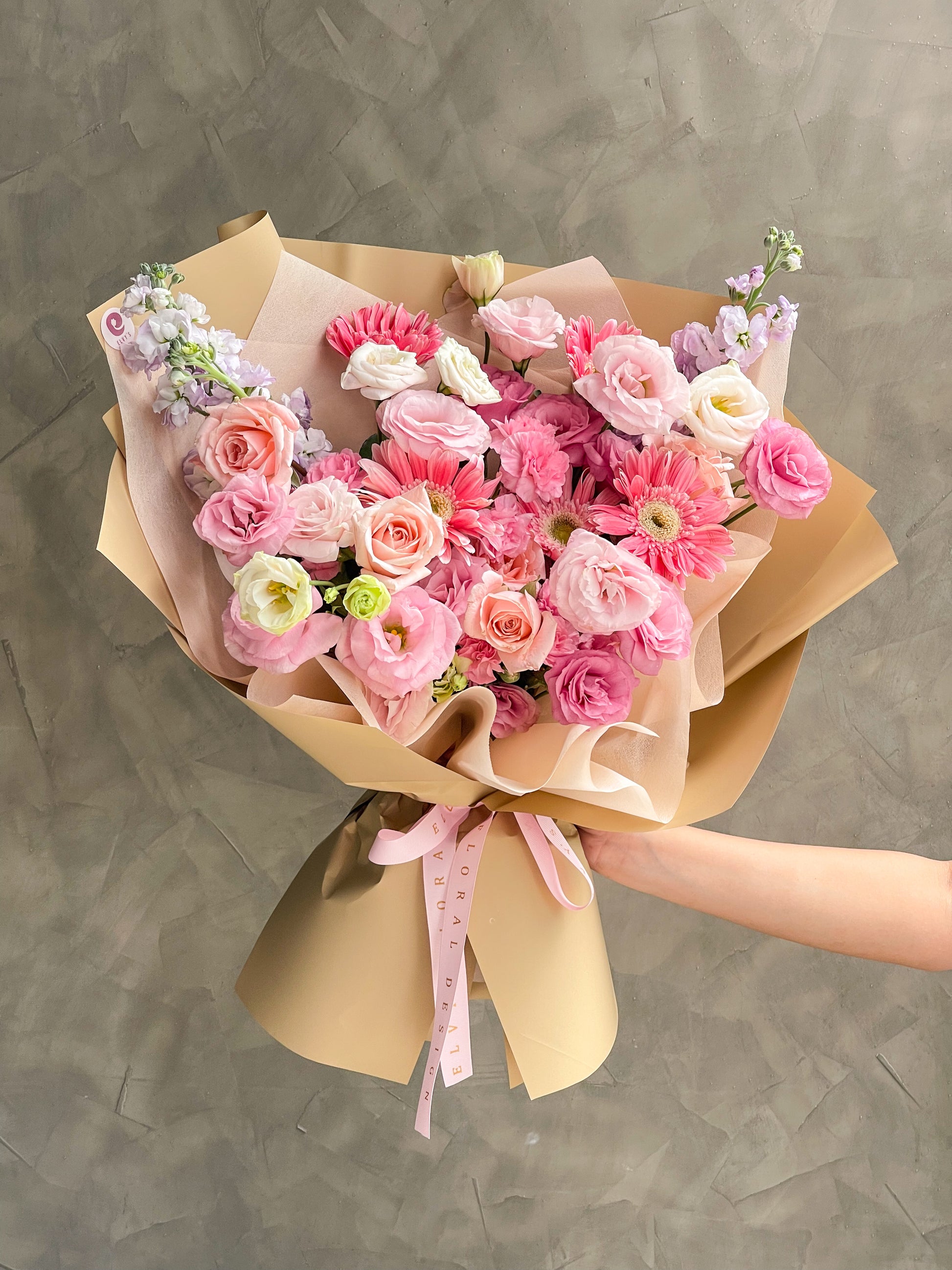 Description: Muted Cherry combines soft pink hues and delicate blooms to create a bouquet full of grace and charm. Featuring gerbera, lisianthus, Philippine roses, and carnations, accented with fragrant matthiola, this arrangement is a refined choice for Valentine’s Day or any special occasion where understated elegance speaks volumes.
