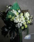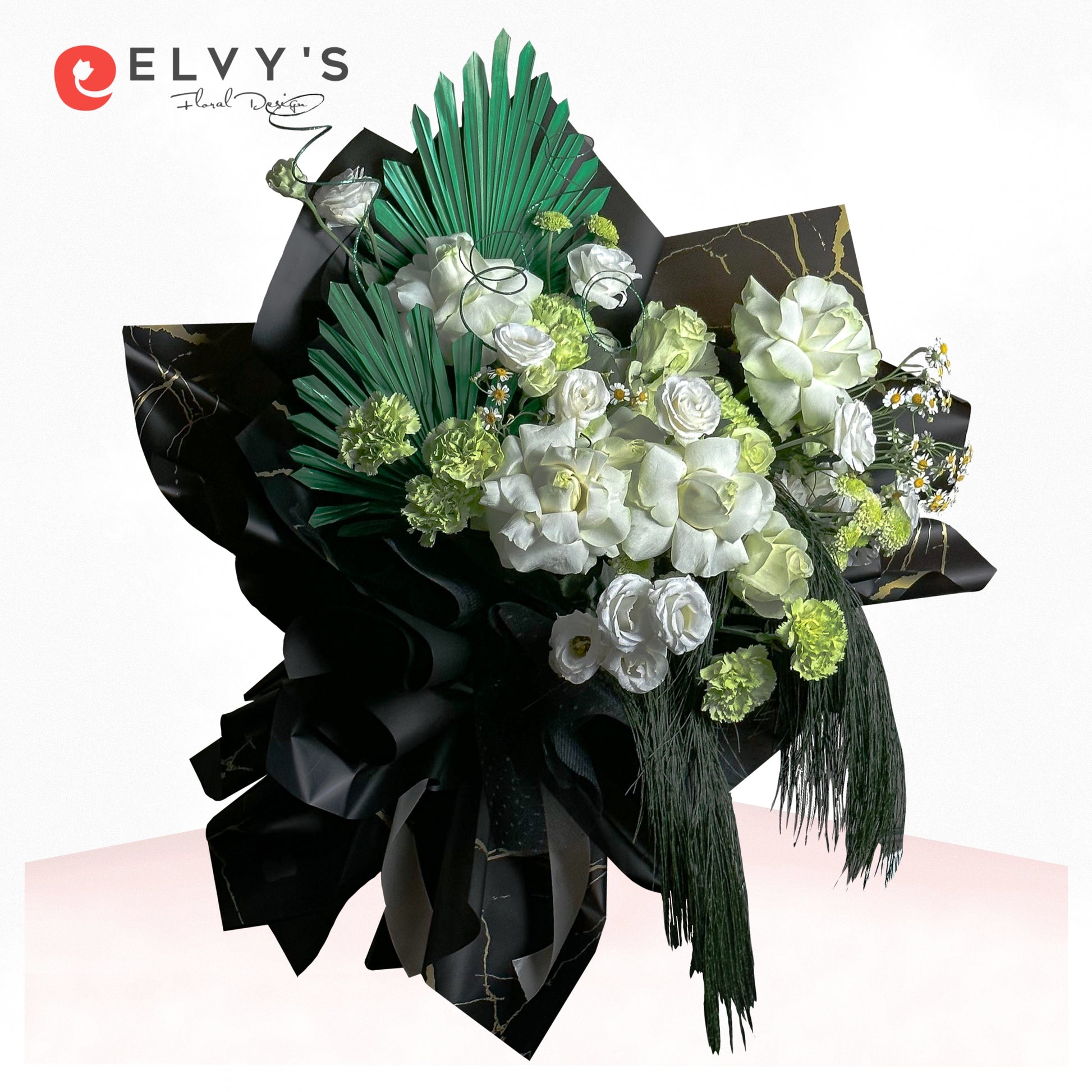 Pristine white Holland roses, charming carnations, lush green grass, delicate chamomile, and native anahaw leaves come together in a sleek black wrapper. This captivating blend of beauty and sophistication is perfect for any occasion, adding a touch of natural charm to your space.