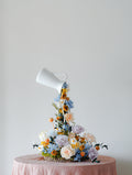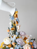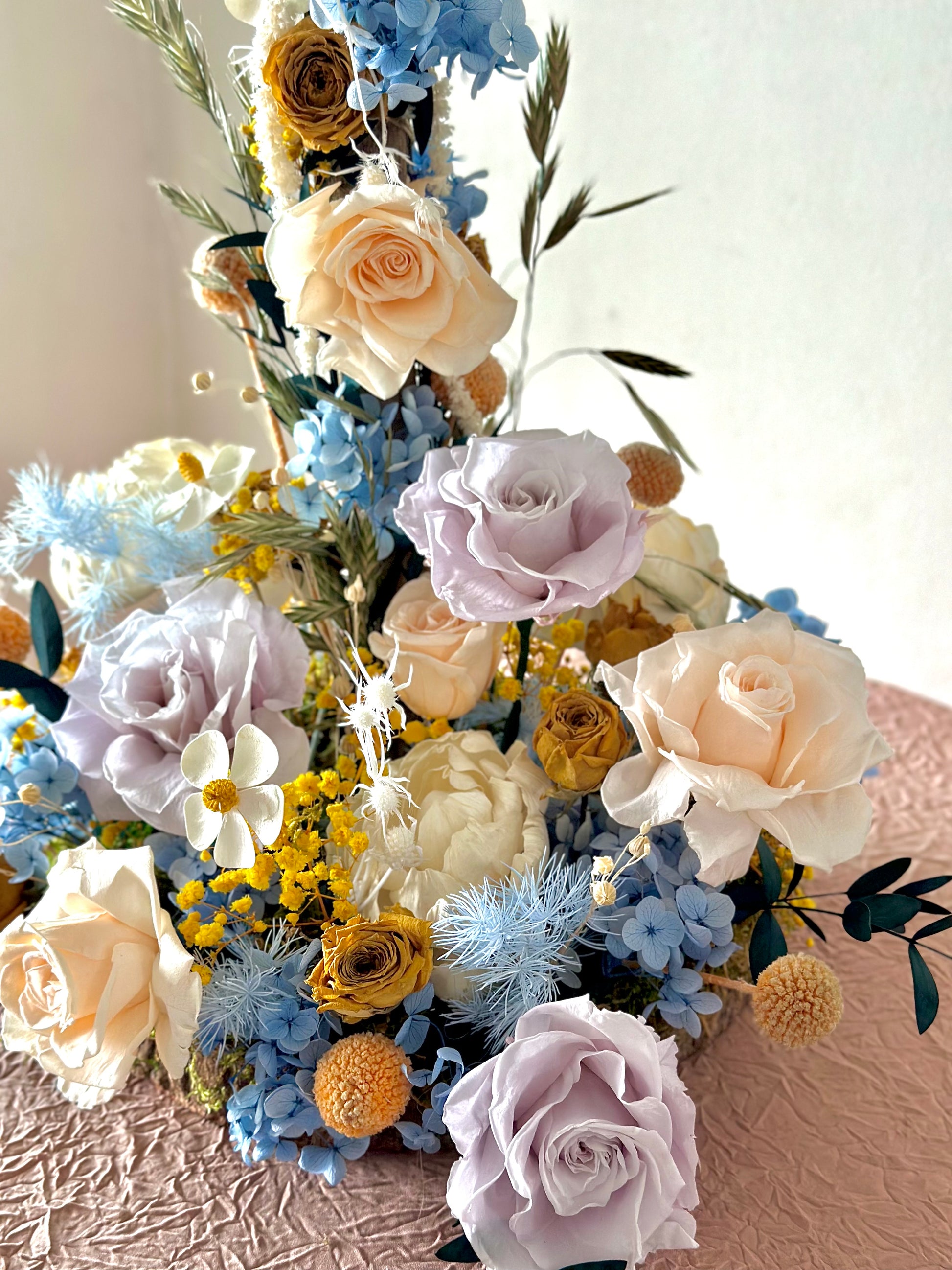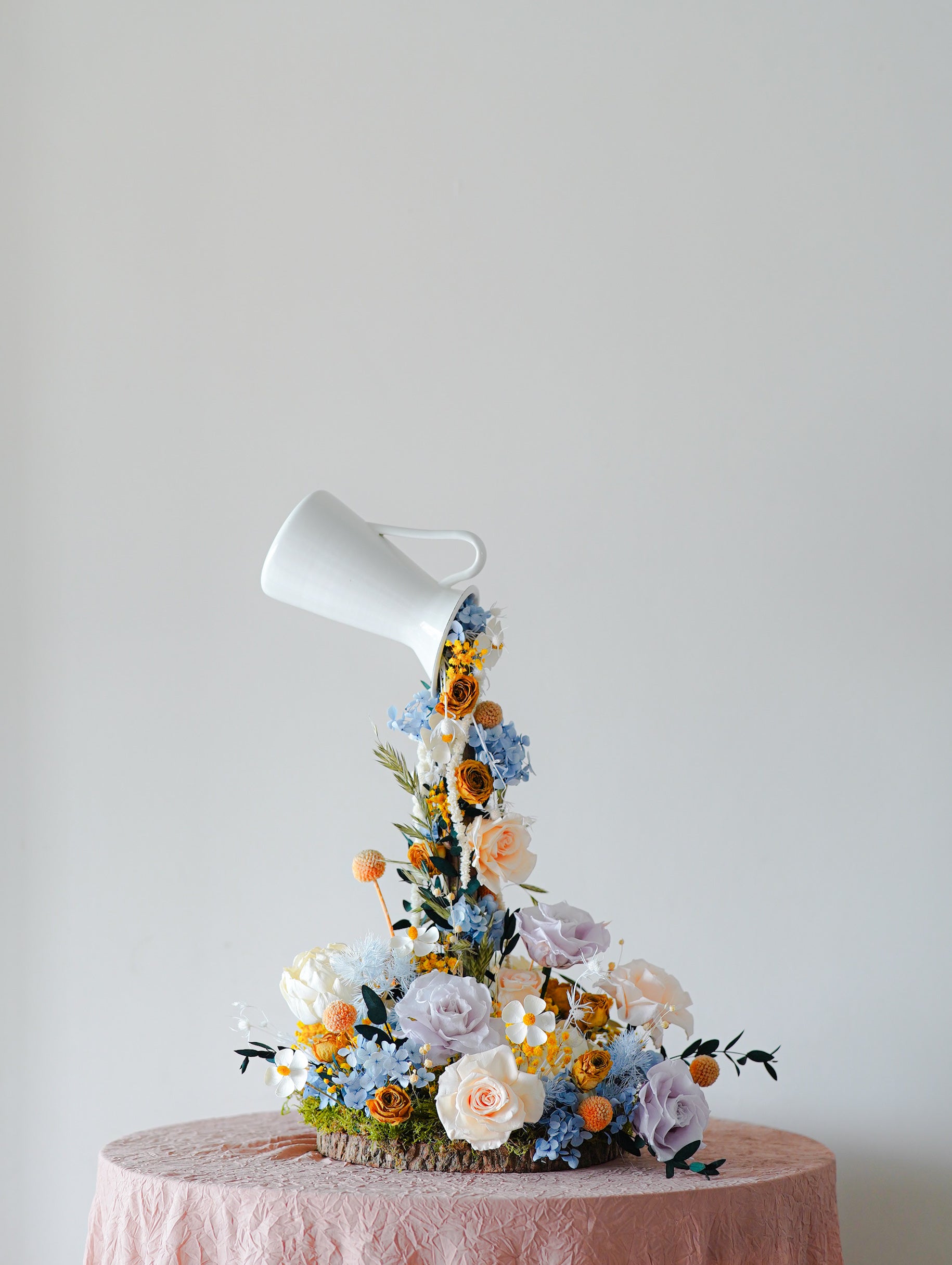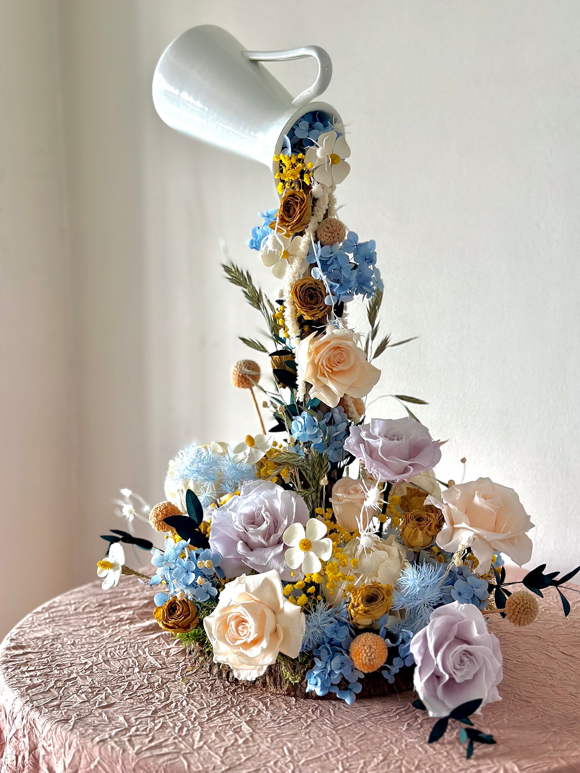 Pouring Love is a unique arrangement crafted from natural and preserved flowers. Featuring a whimsical design with blooms cascading from a floating pitcher, it symbolizes an outpouring of affection and care. The soft hues of preserved roses and hydrangeas blend beautifully with craspedia and dried foliage, creating a timeless and elegant piece.
