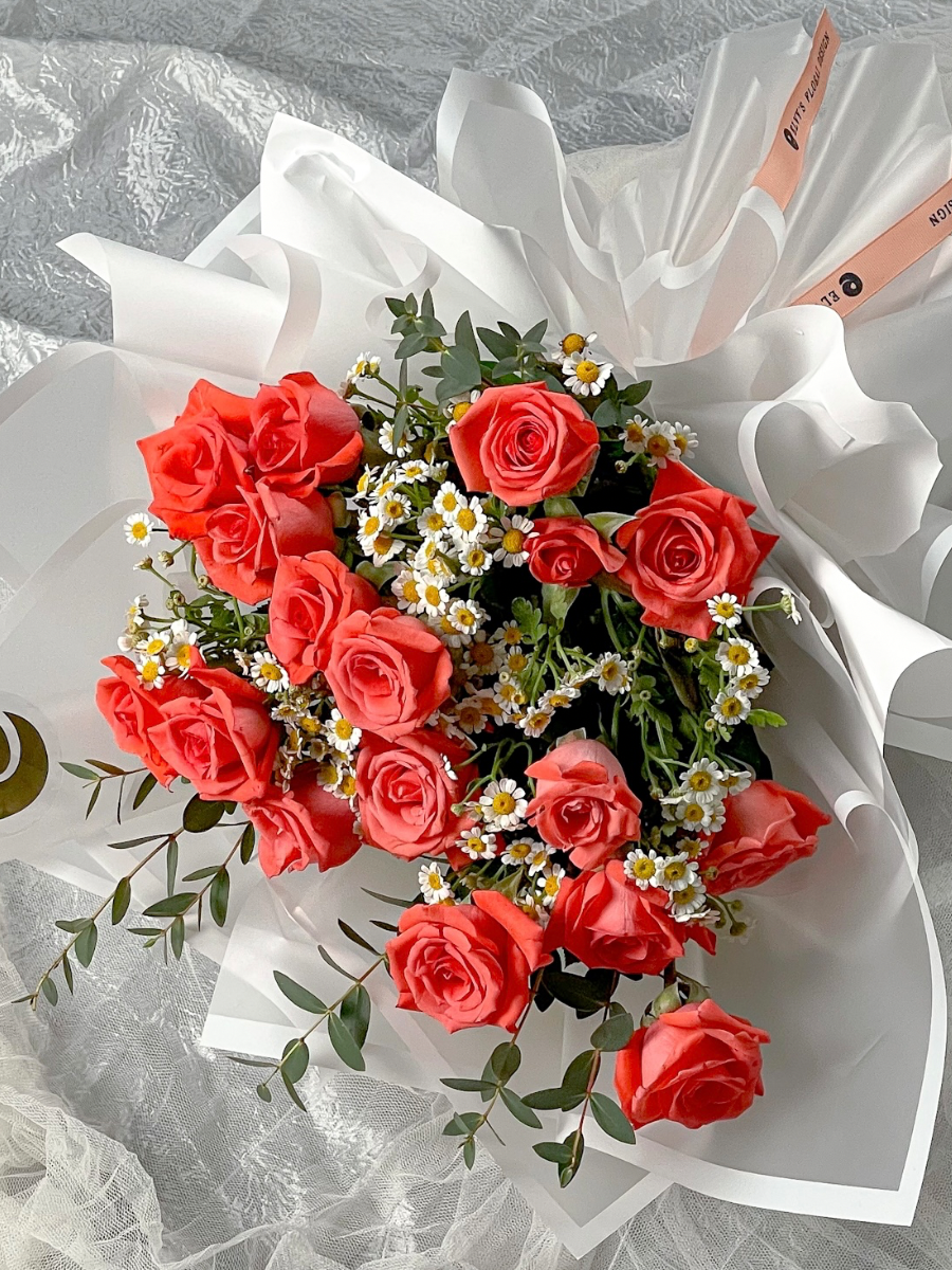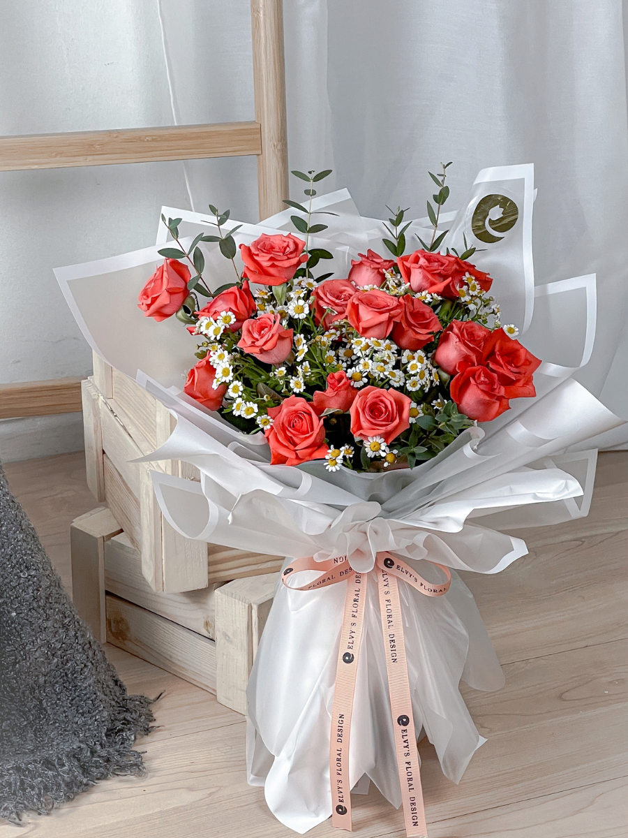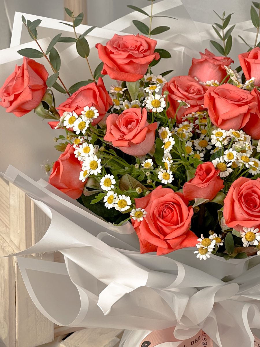 Experience the vibrant charm of our bouquet featuring 2 dozen pomelo orange local roses. These stunning roses, handpicked for their captivating color and elegance, exude warmth and joy. Delicately complemented by chamomile fillers, this arrangement brings a touch of whimsy and fragrance. Celebrate life's special moments or brighten any space with this enchanting bouquet, a perfect blend of beauty and cheer.