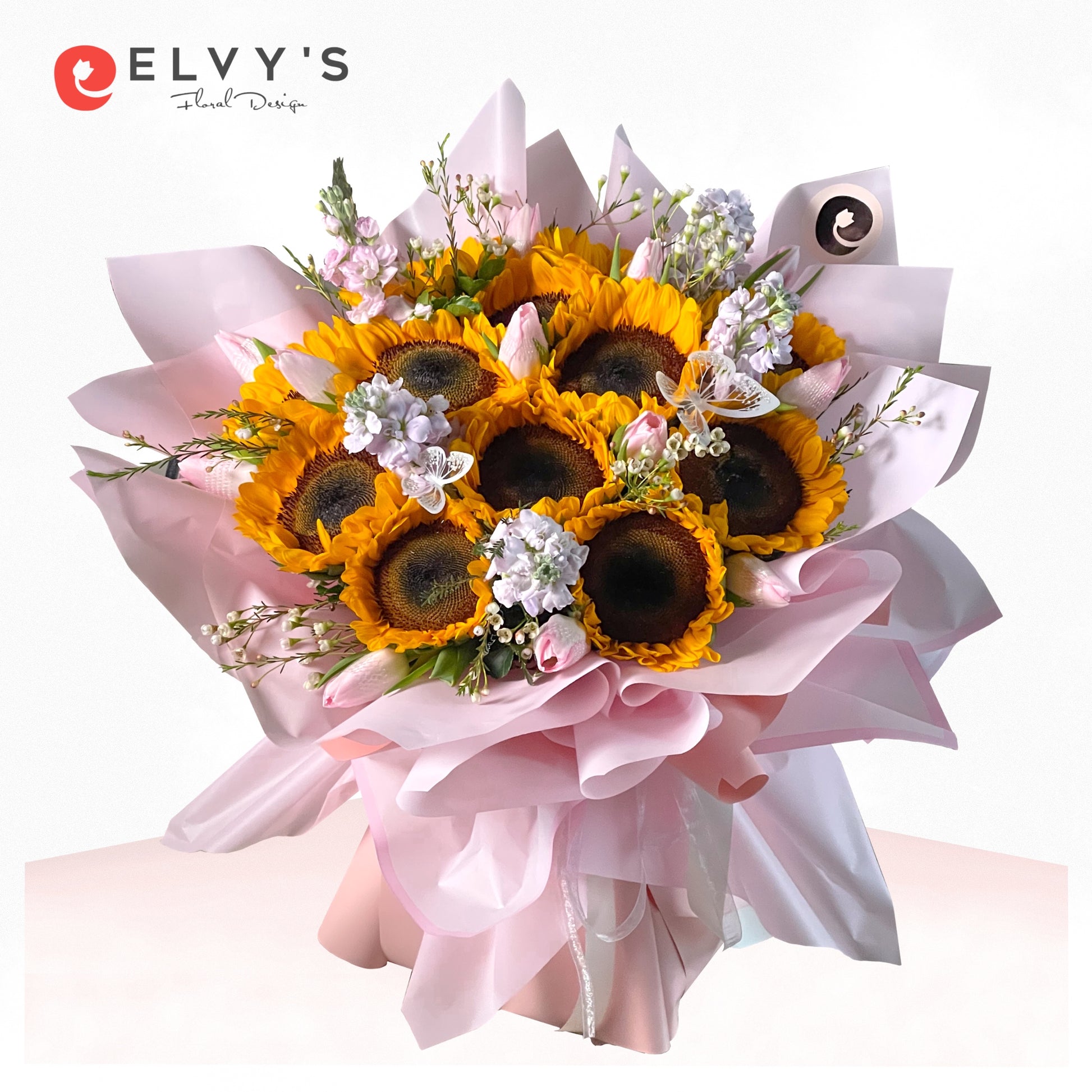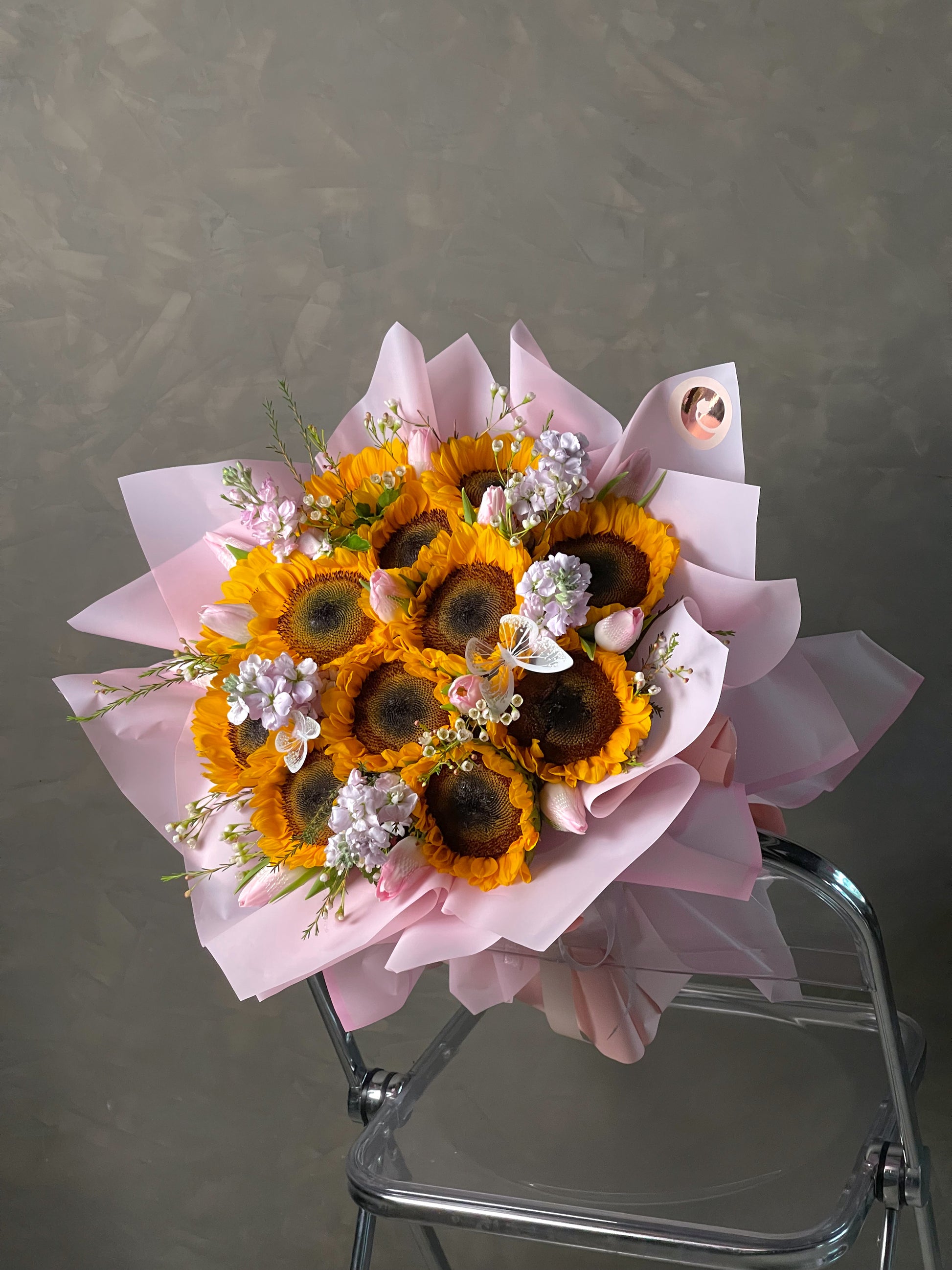Description: Celebrate Valentine’s Day with Quinn, a beautifully crafted round bouquet featuring vibrant sunflowers and elegant Holland tulips. Delicate wax flowers, mattiola, and a charming artificial butterfly accent complete this stunning arrangement, making it a perfect way to express your love and admiration.