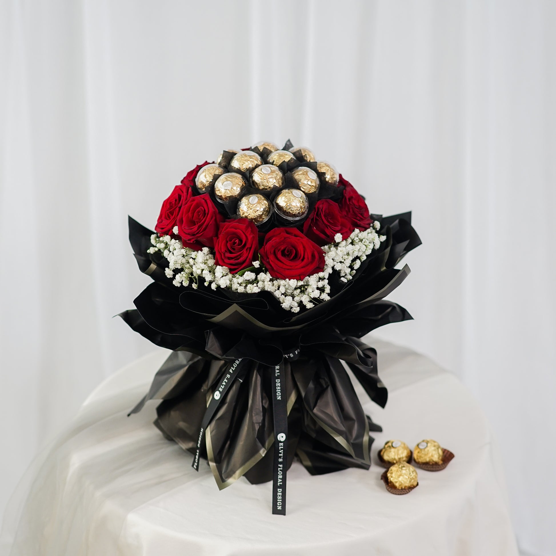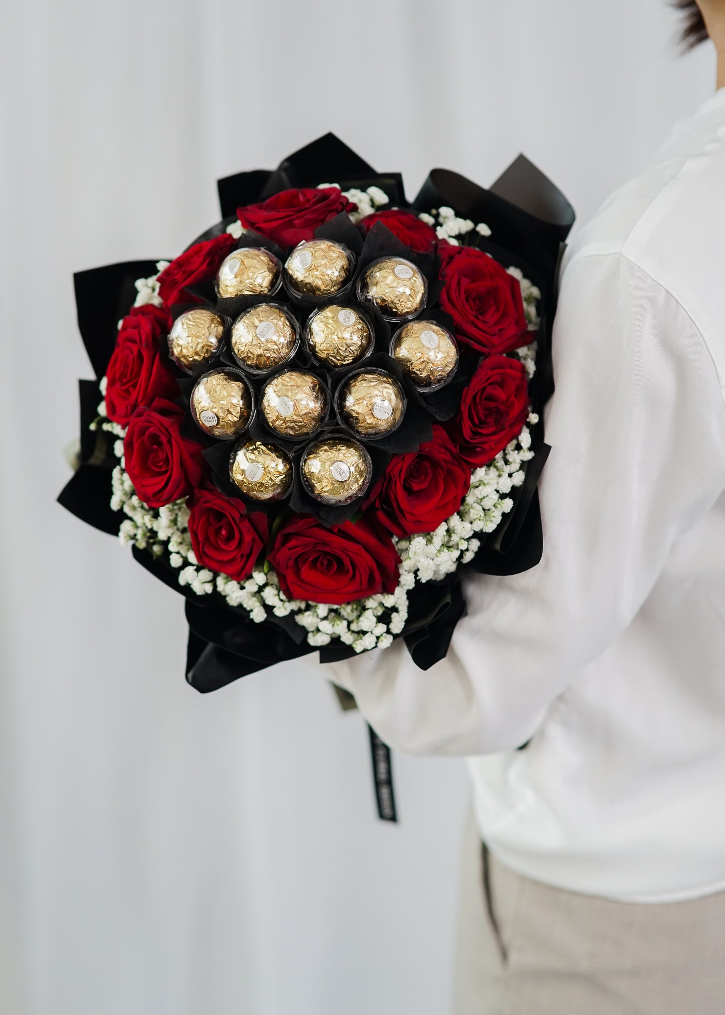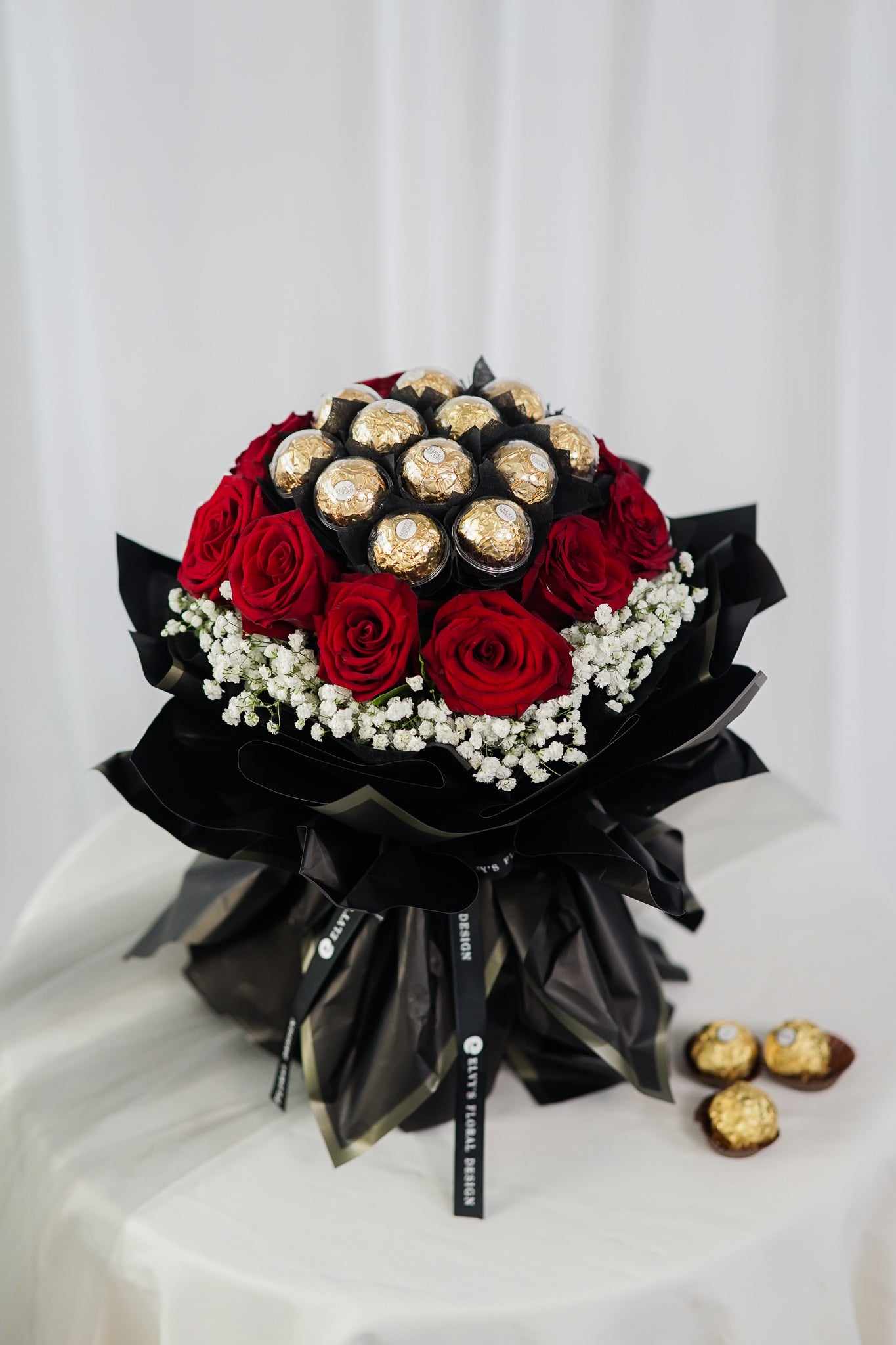 The Red Auburn Ferrero Bouquet is a harmonious fusion of indulgence and beauty, guaranteed to leave a lasting impression and ignite the senses.