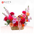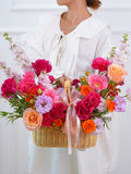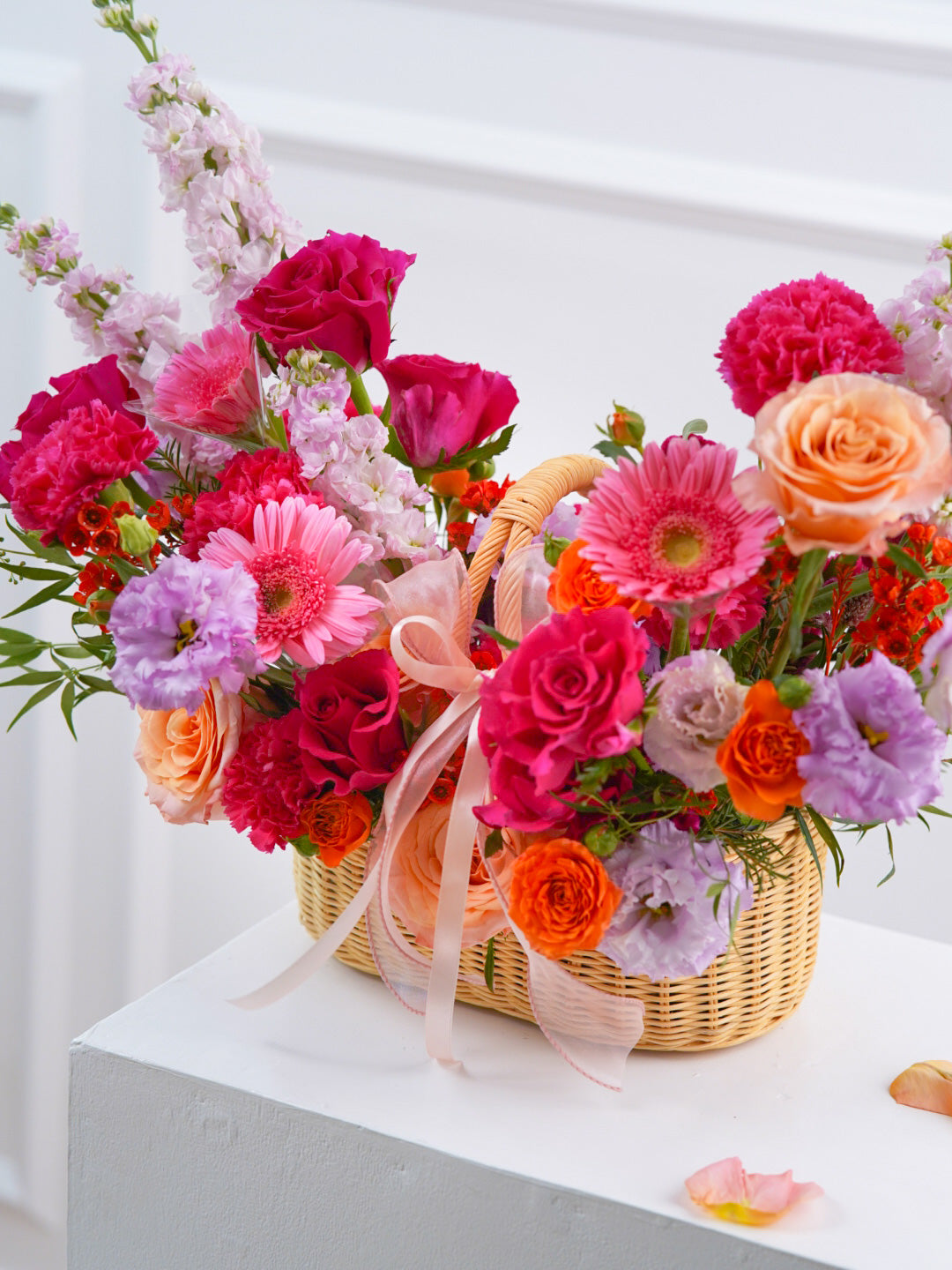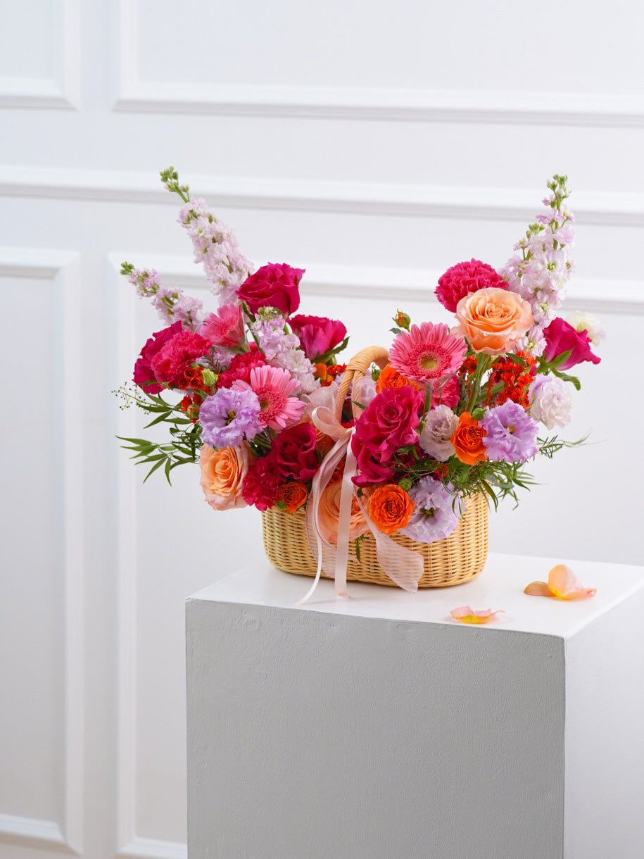 We created this basket arrangement to present the beauty of a modern style with blooms in vibrant pink and orange colors closely layed out for an opulent look.