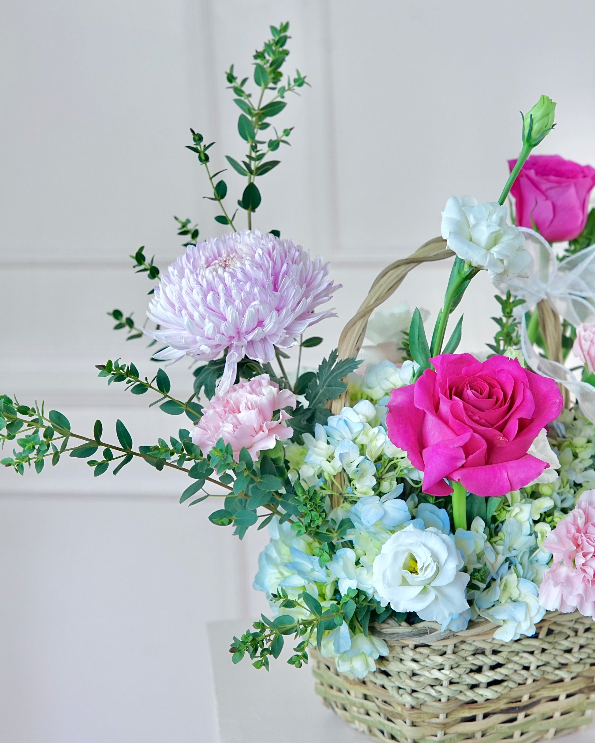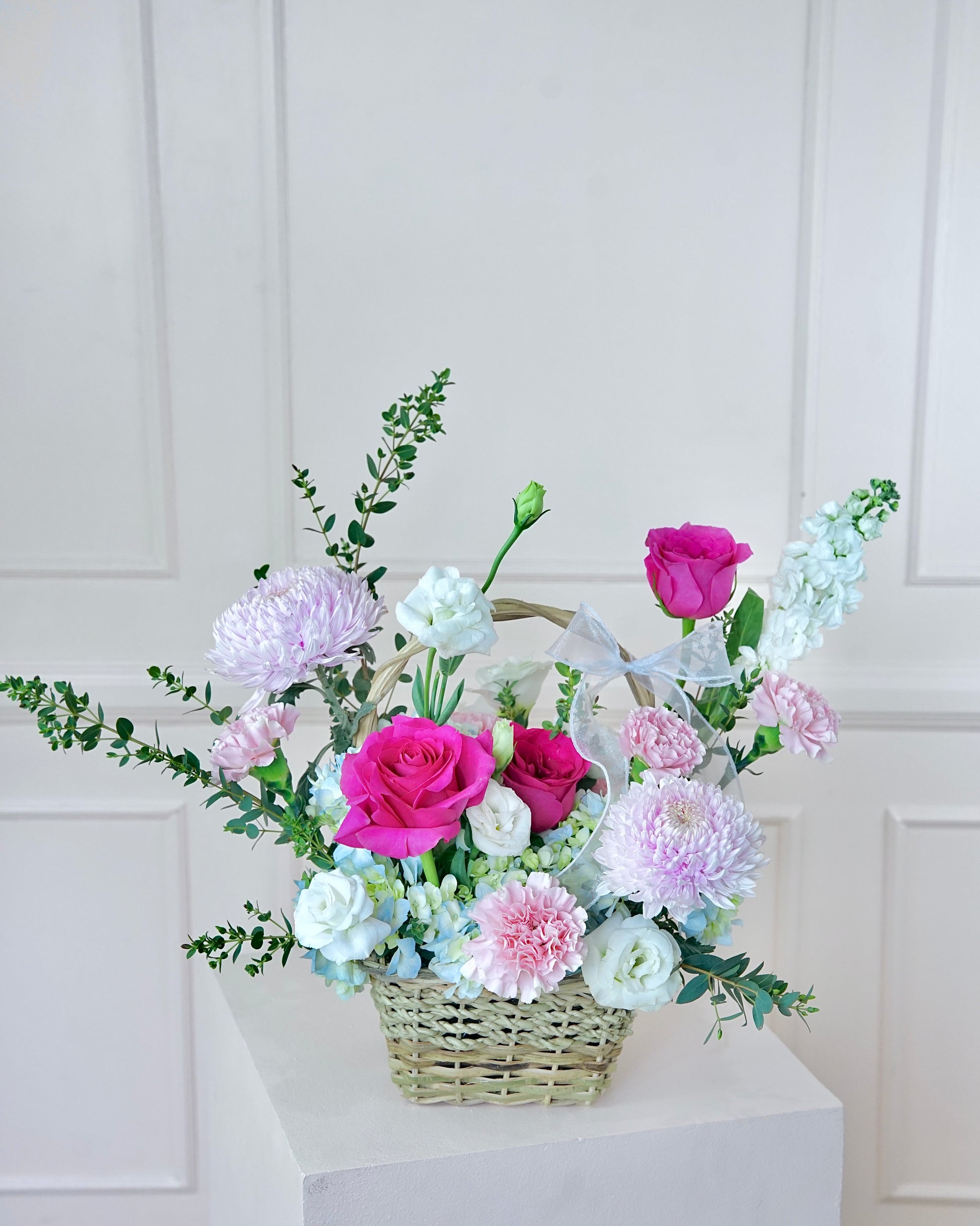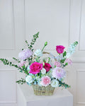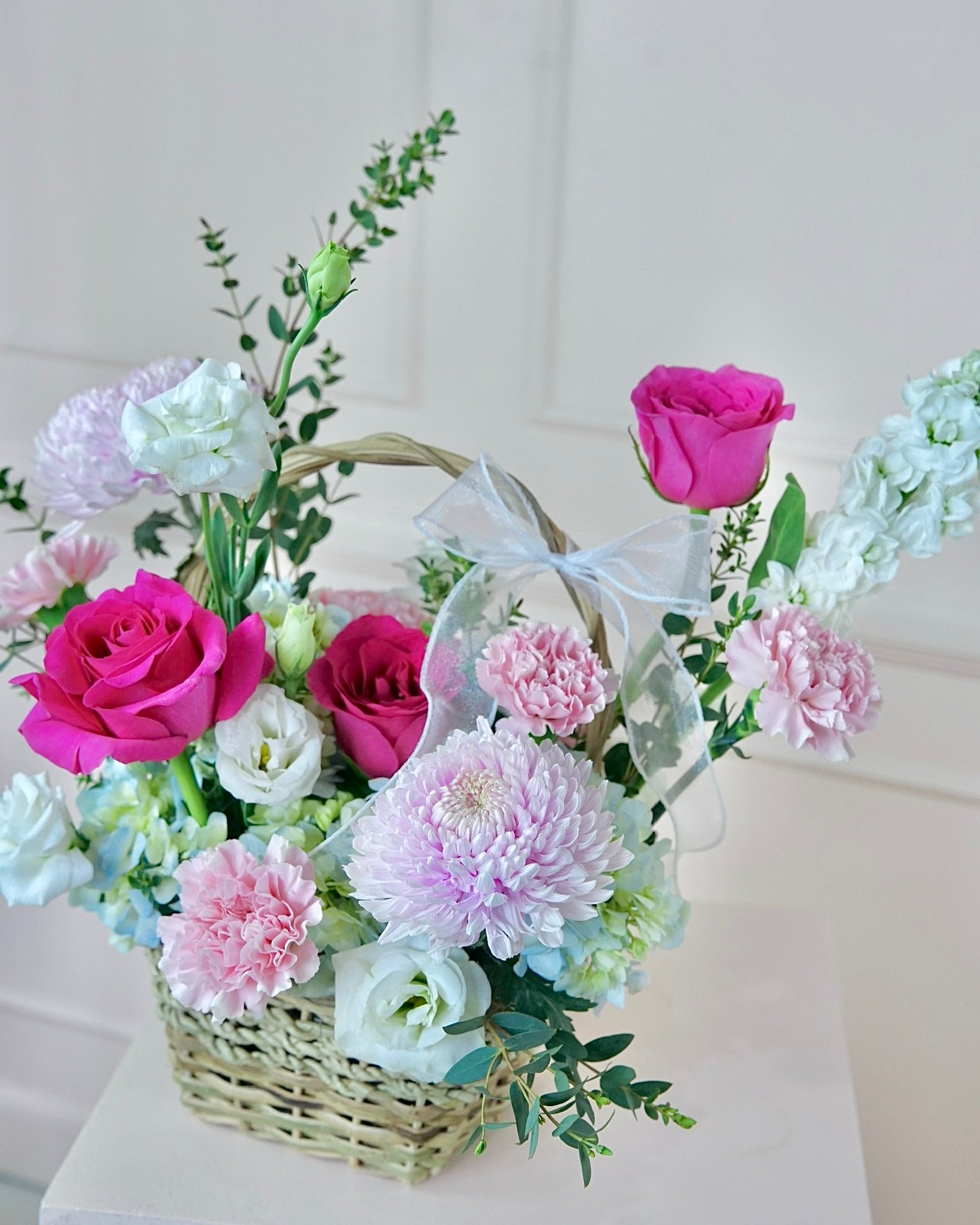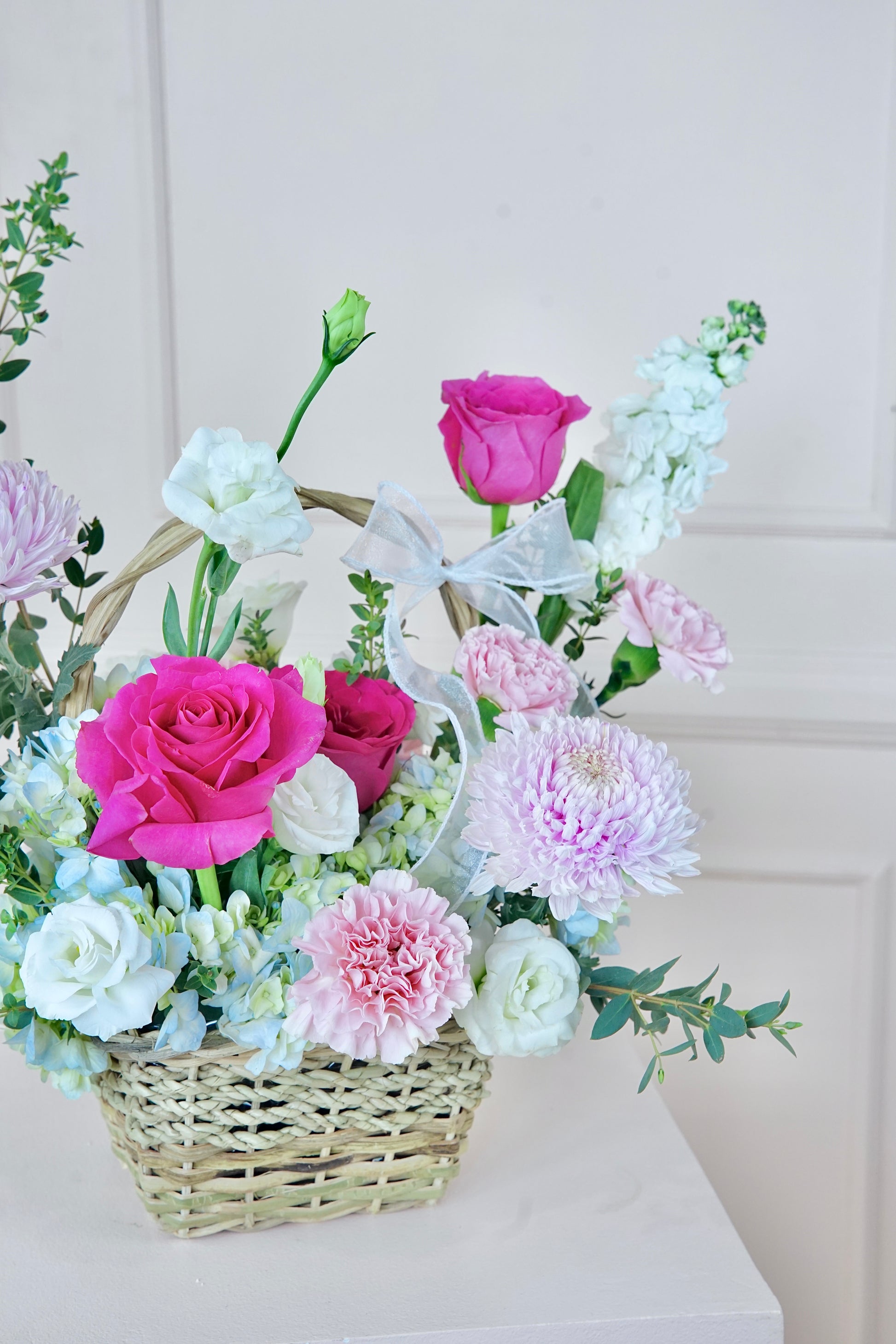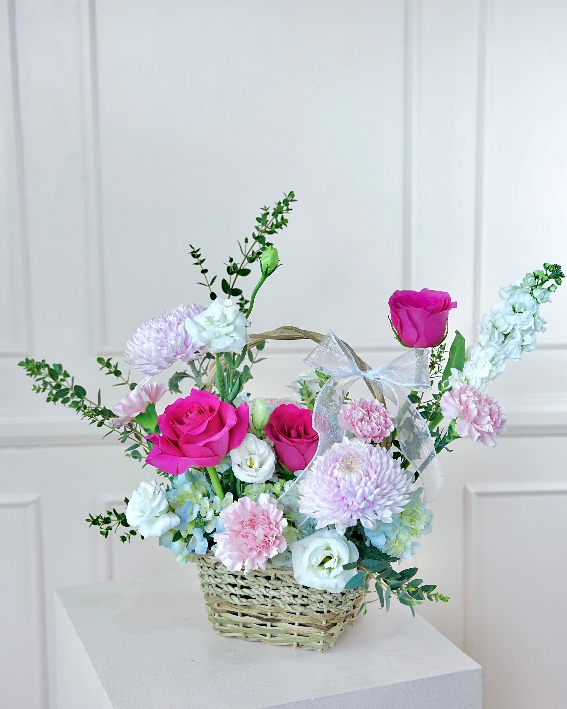 A dreamy basket of soft blooms, Reverie Nest brings the warmth of home and the tenderness of memory—just like Mom. Wrapped in quiet tones of pink and cream, this arrangement is a gentle reminder of love that lingers and comforts.