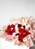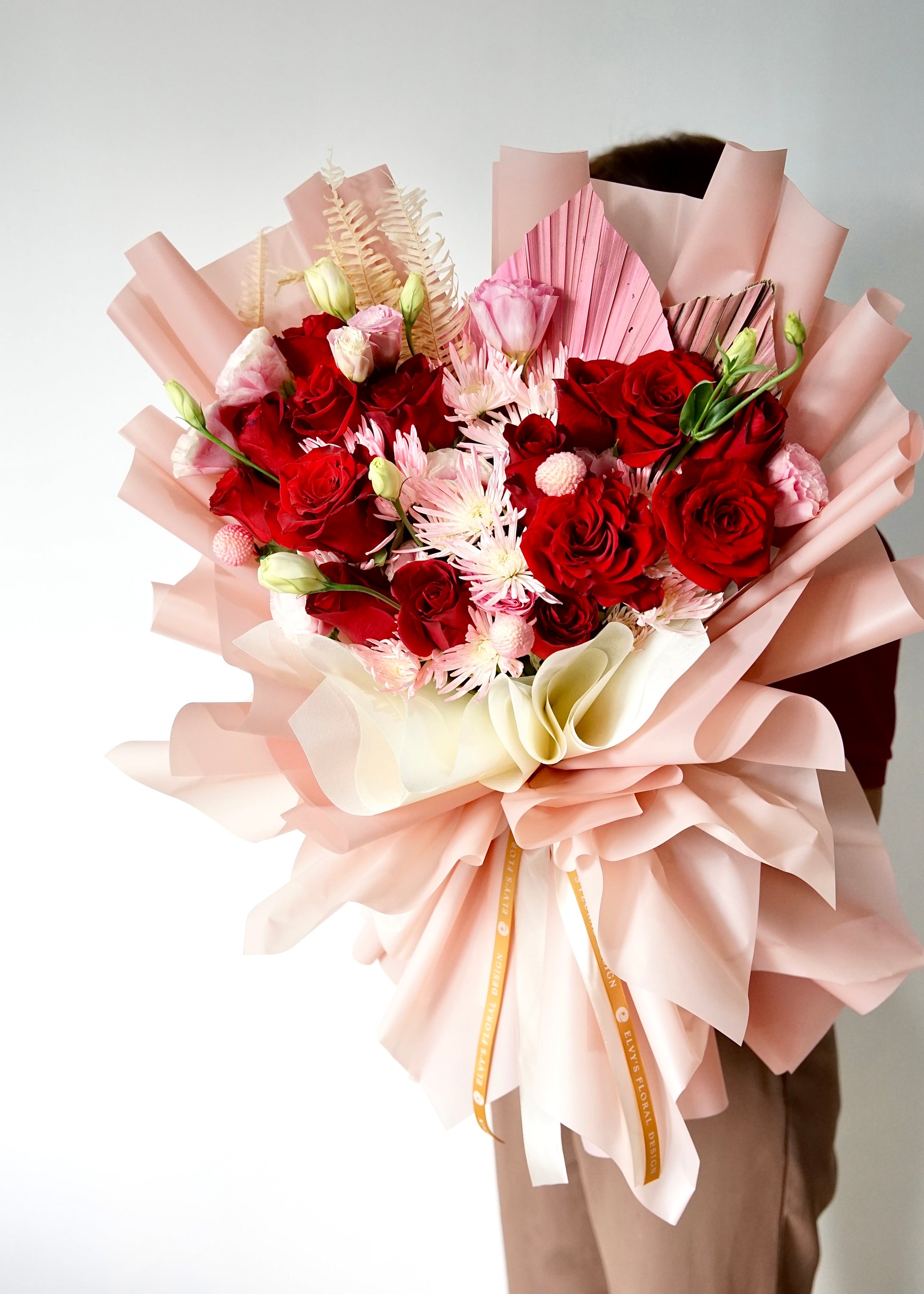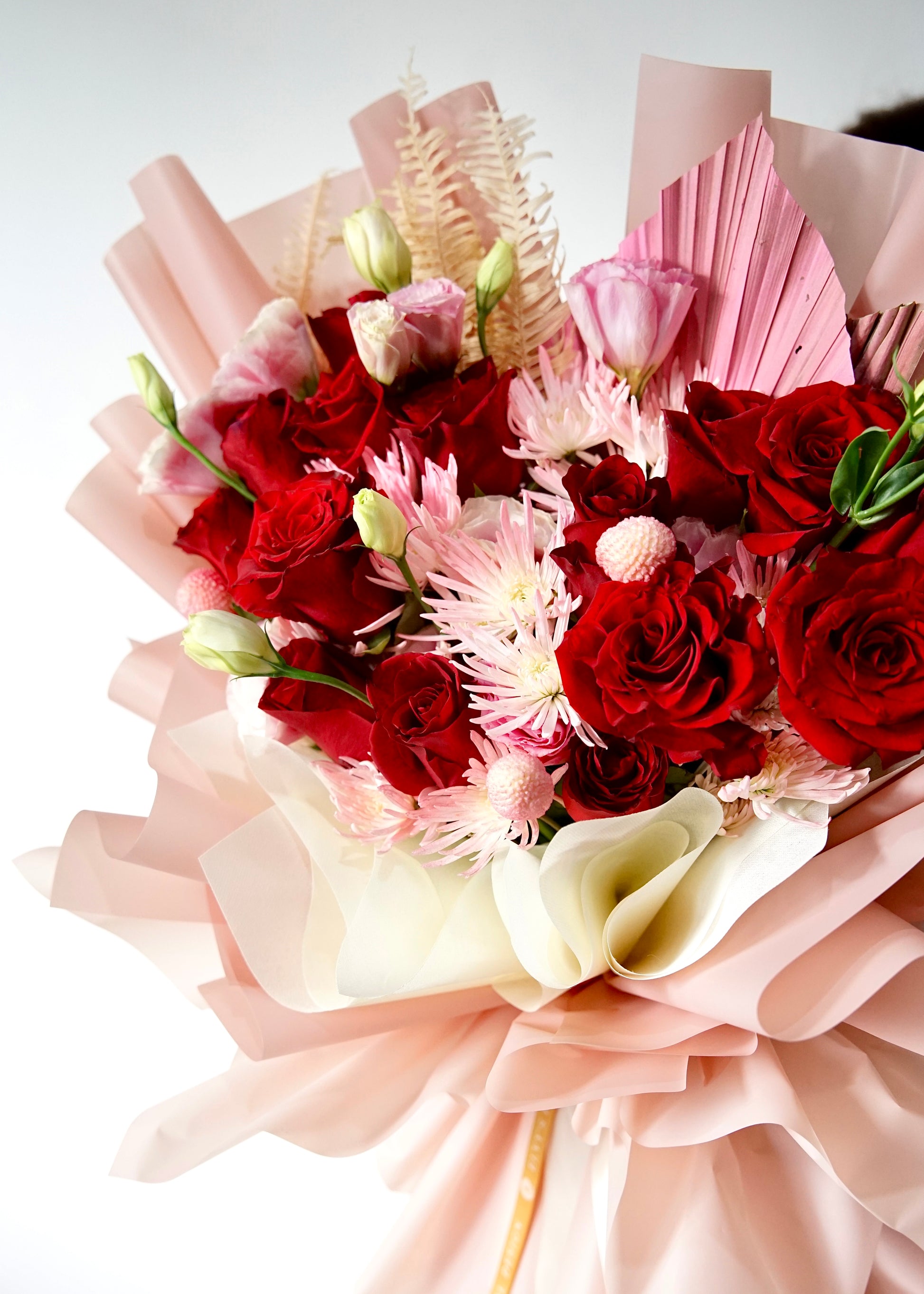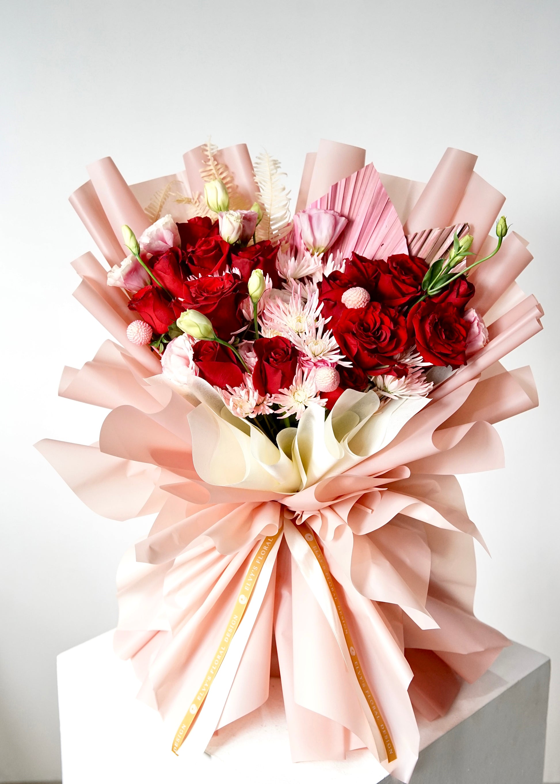 - Description: Ecuadorian red roses paired with soft pink mums and lisianthus, accented with dried craspedia for gentle texture. Wrapped in layered blush tones, the arrangement balances richness and softness.