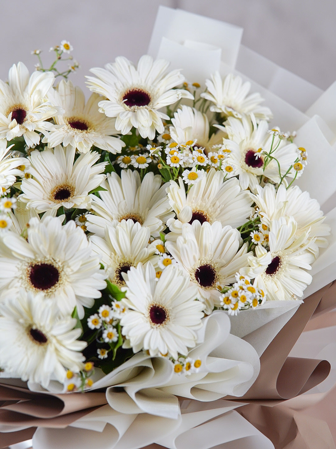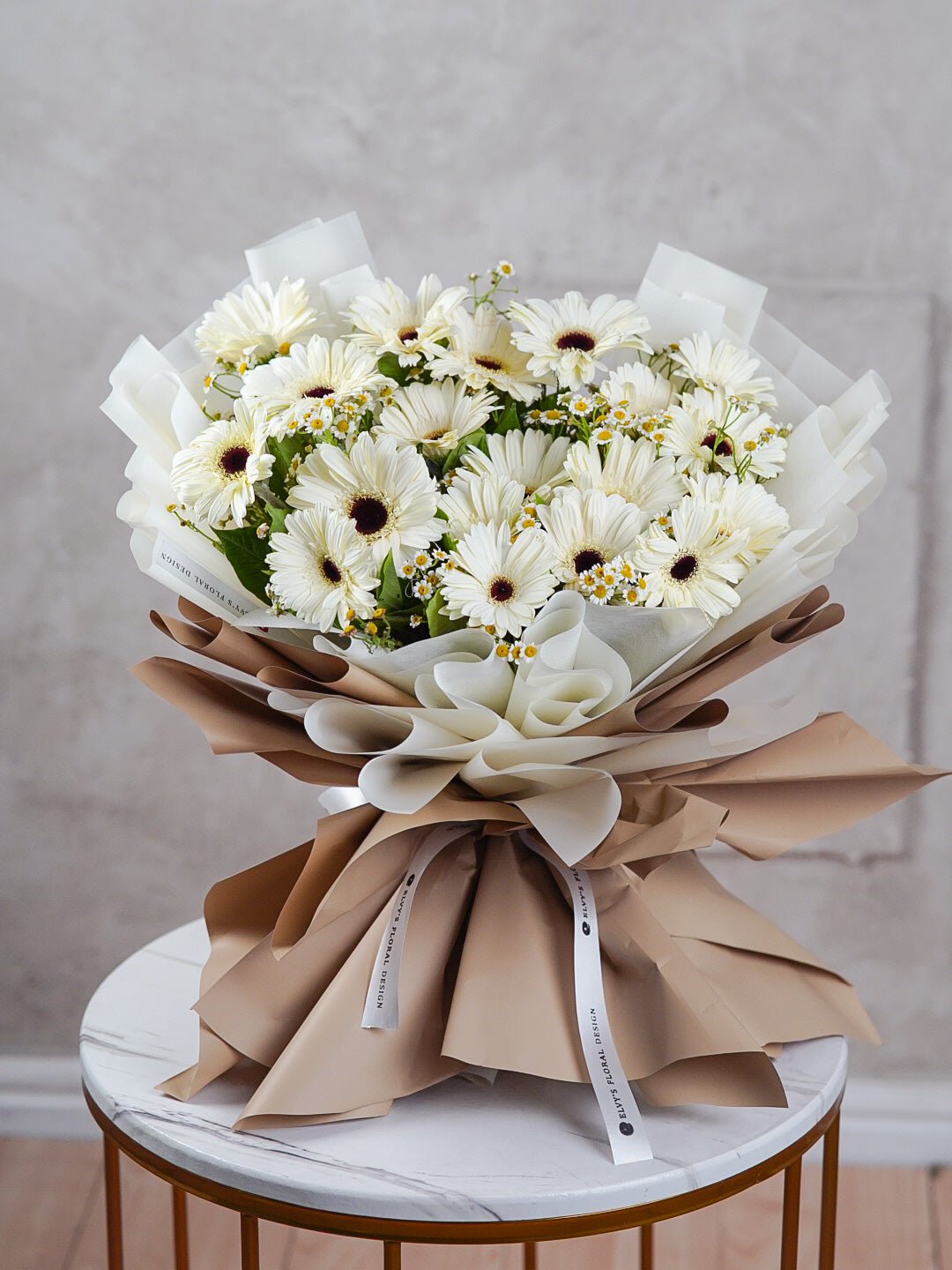 Experience the simple beauty of our 20-stem daisy bouquet, elegantly wrapped in a Korean-inspired style. The pure white daisies create a serene and captivating arrangement, perfect for adding a touch of elegance to any occasion. Embrace the understated charm of this bouquet, designed to bring joy and serenity to your day.