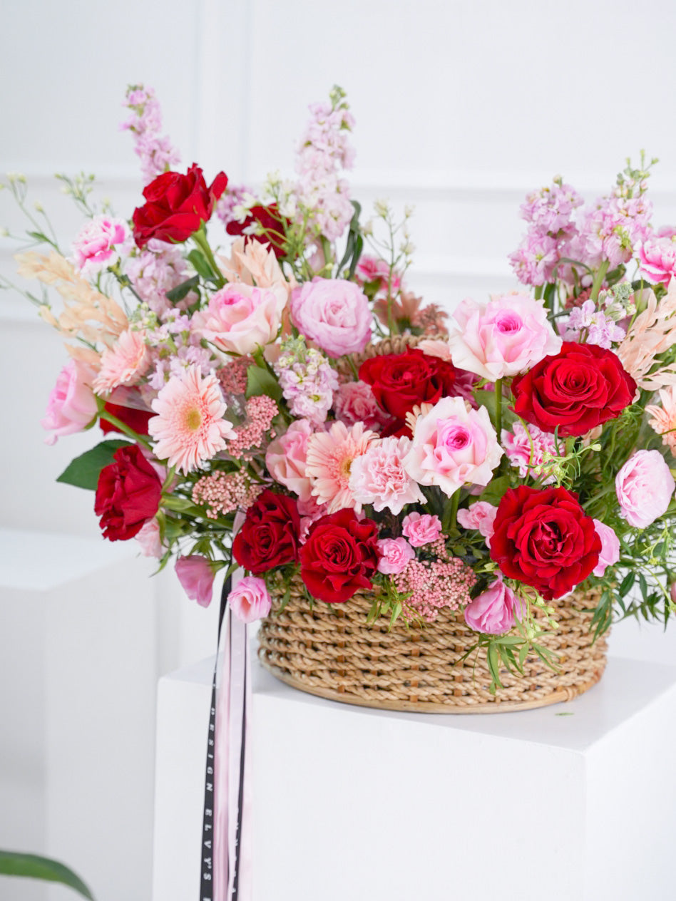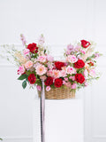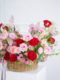 We created this basket arrangement to present the beauty of natural wildflowers with bright pink and red blooms tightly bound to showcase an opulent look.