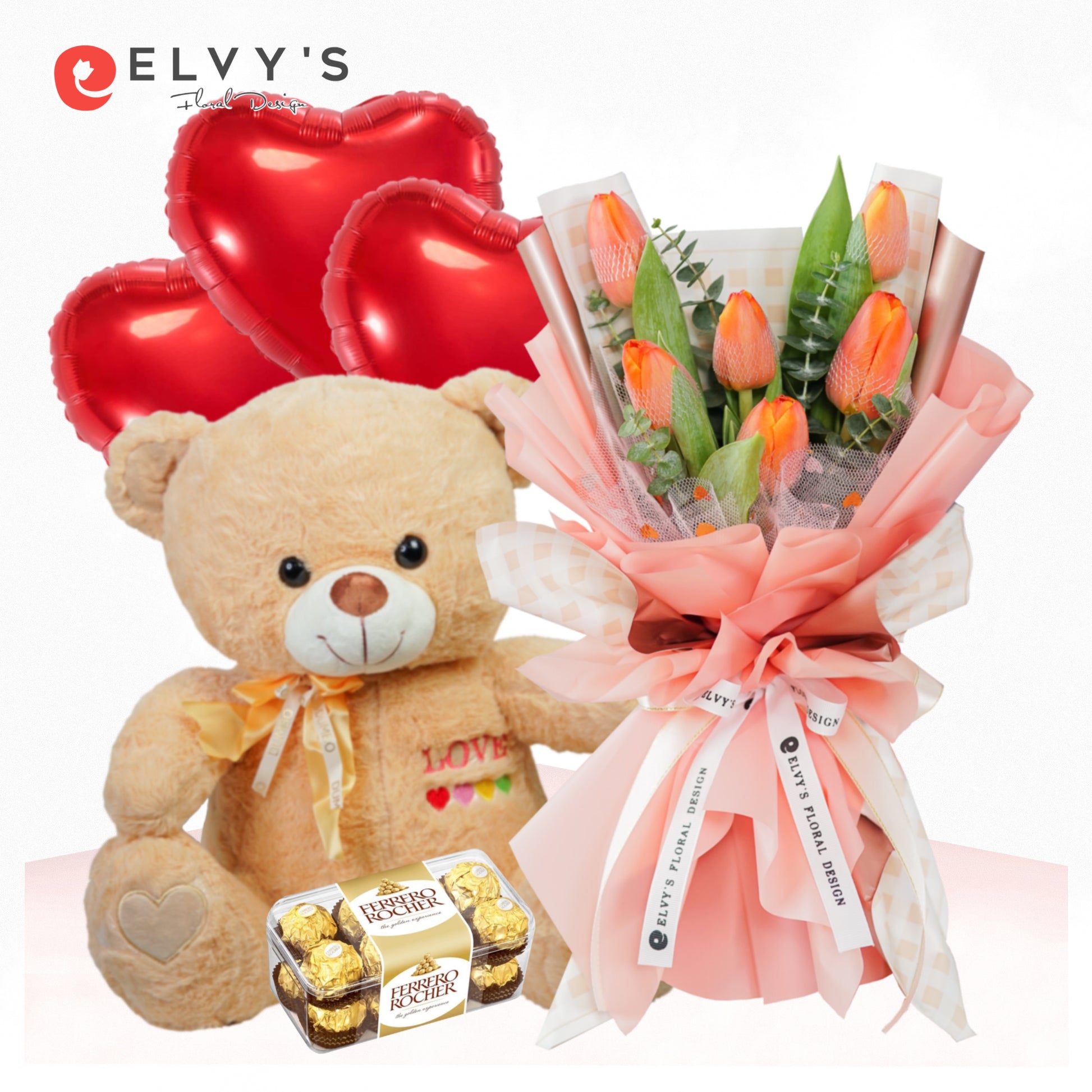Introducing our exquisite Bundle Package, the ultimate gift collection for your loved ones! Spoil them with a stunning bouquet of half a dozen Holland tulips, handpicked and arranged to perfection, exuding elegance and grace. Embrace the cuddly love with our adorable 16-inch teddy bear, guaranteed to melt hearts and become a cherished companion. Delight their taste buds with the decadence of 16 pieces of Ferrero Rocher chocolates, nestled in a beautifully presented box. To add an extra dose of romance, we've included three mesmerizing mylar heart balloons that will soar high and fill the air with love. This carefully curated bundle promises an unforgettable experience, combining beauty, sweetness, and affection to make any occasion truly magical.