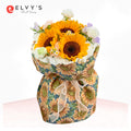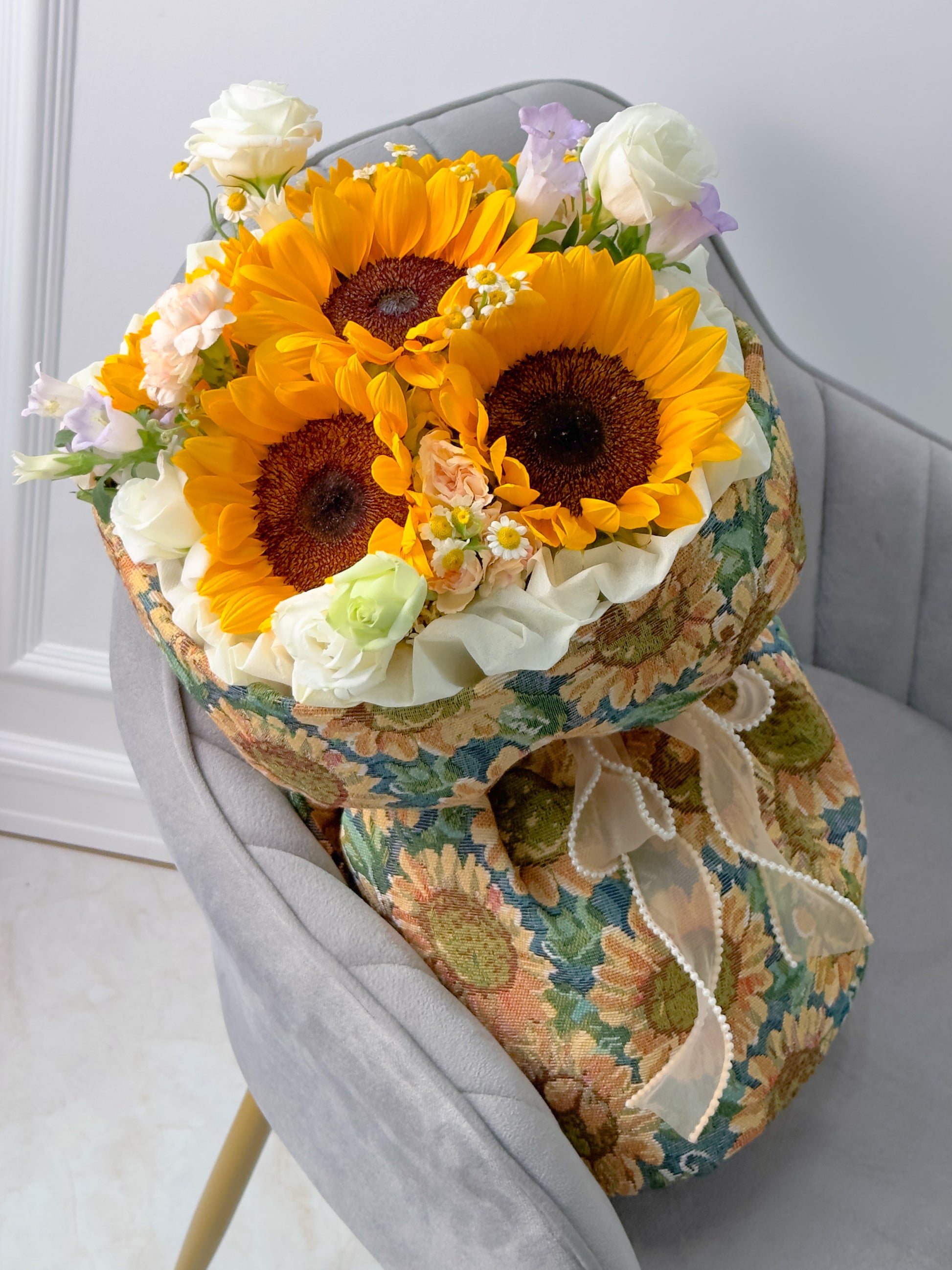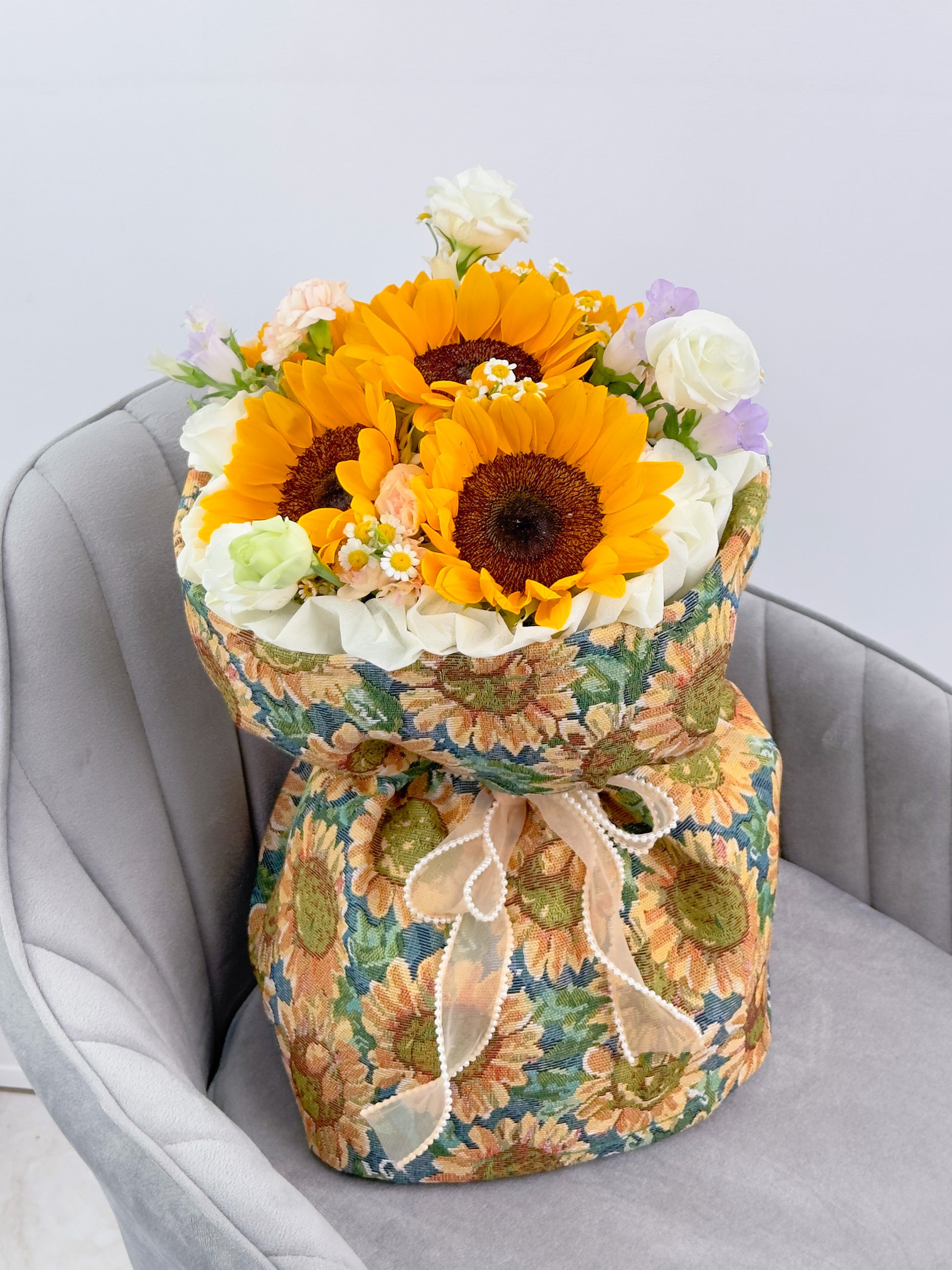 This bouquet is all beautifully presented in our round bouquet style and wrapped in a unique painting-like tweed cloth.