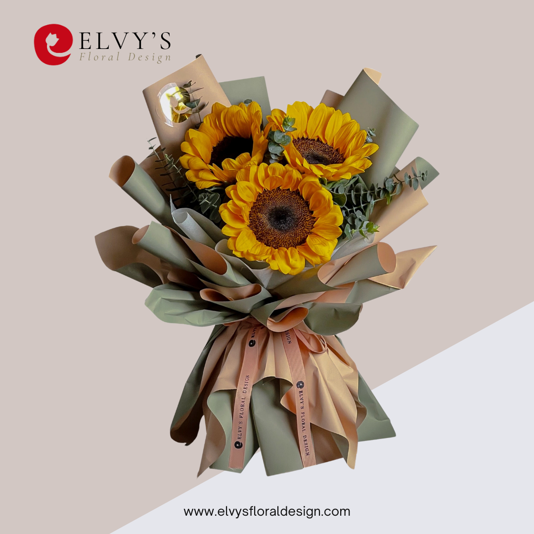 Description: Brighten up Valentine’s Day with Sunny Aquela, a simple yet stunning bouquet featuring three vibrant sunflowers paired with fresh eucalyptus. Its cheerful golden petals and natural charm make it a perfect gift to spread joy and warmth to someone special.