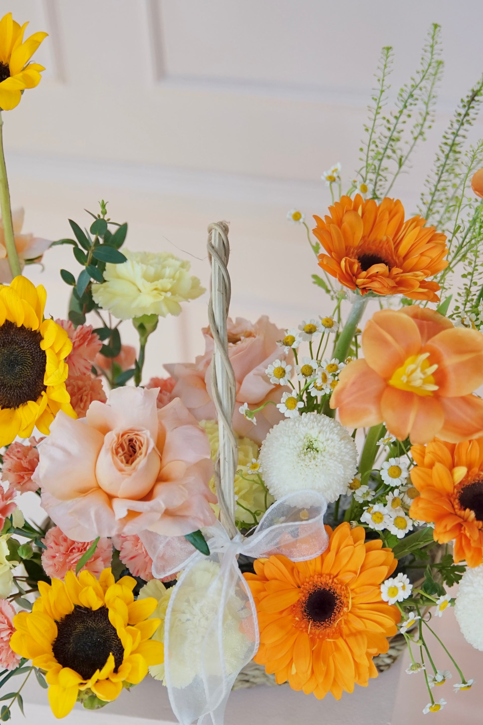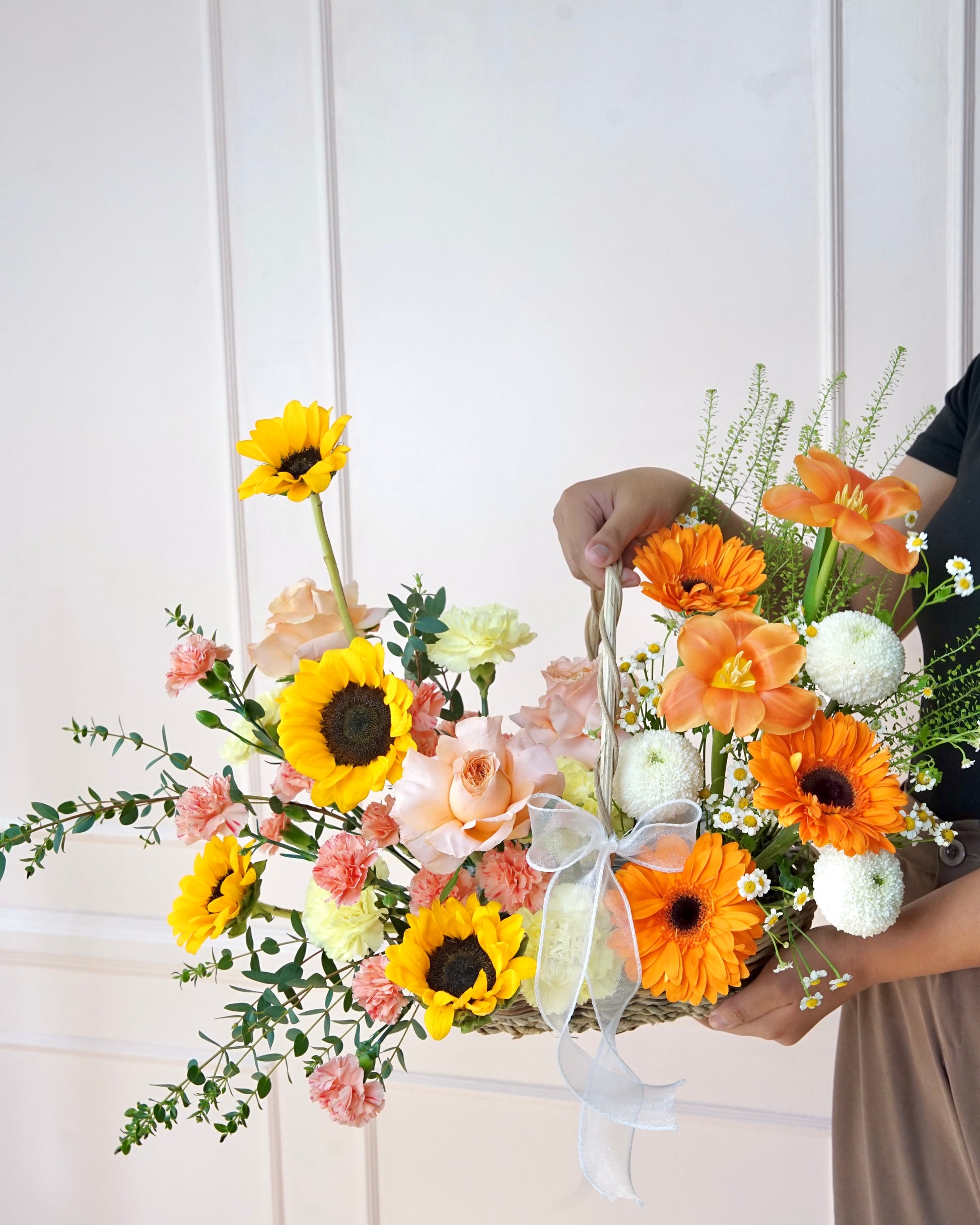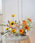 Main Flowers: Sunflowers, Peach Holland Roses, Orange Gerbera, Tulips Orange, Yellow Carnation.