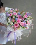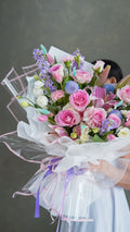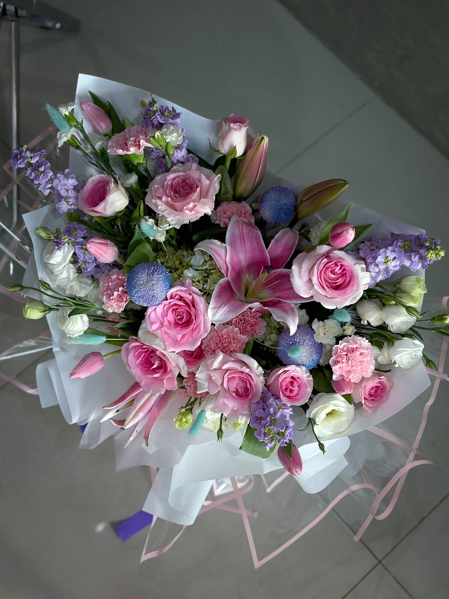 Description: Think Pink is an enchanting bouquet crafted for Valentine's Day, featuring a luxurious mix of stargazers, Holland tulips, and roses, accented by lisianthus, carnations, and playful pingpong blooms. Enhanced with matthiola and soft lagurus, this vibrant arrangement symbolizes love, admiration, and elegance.
