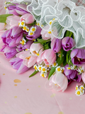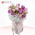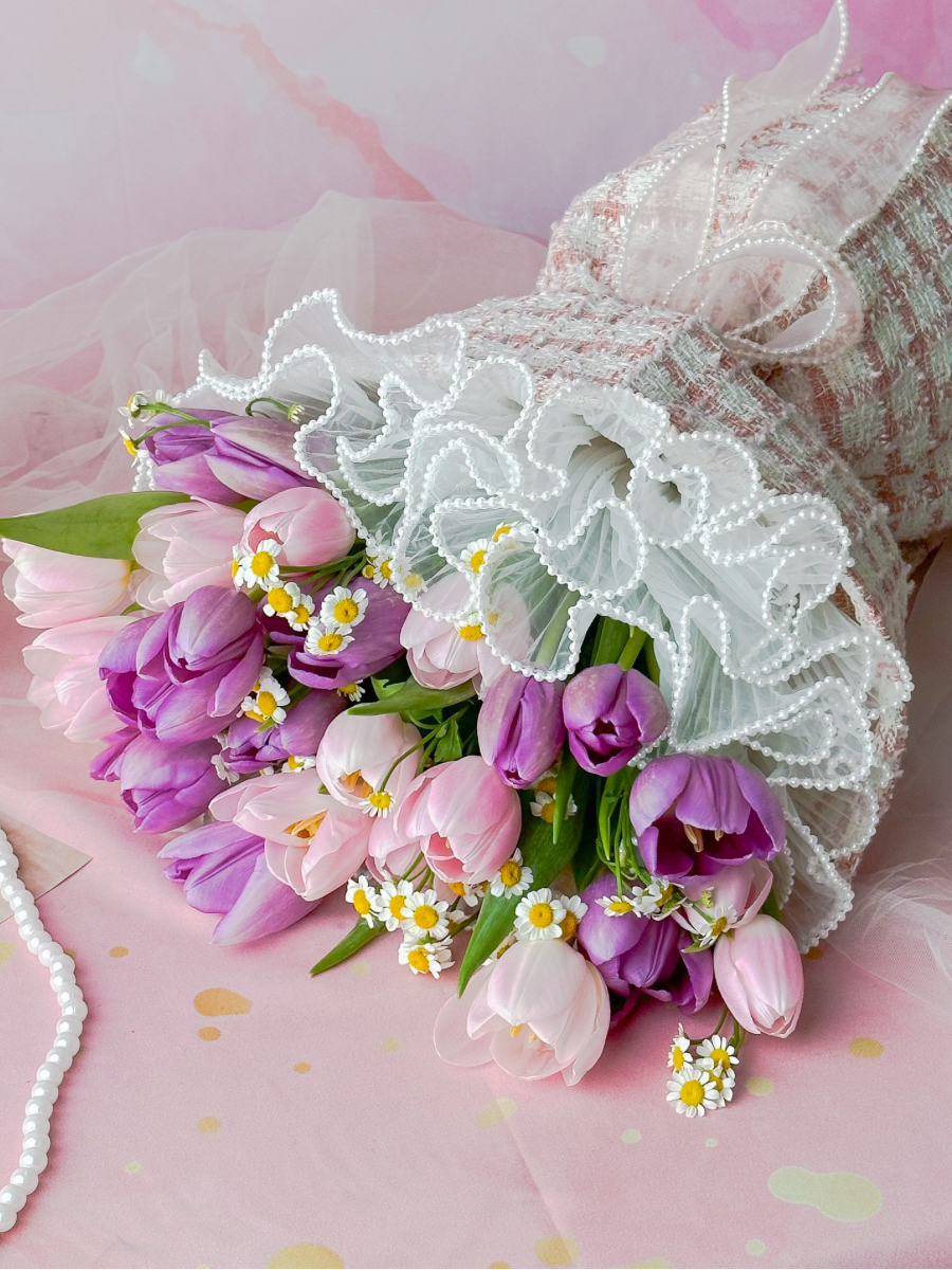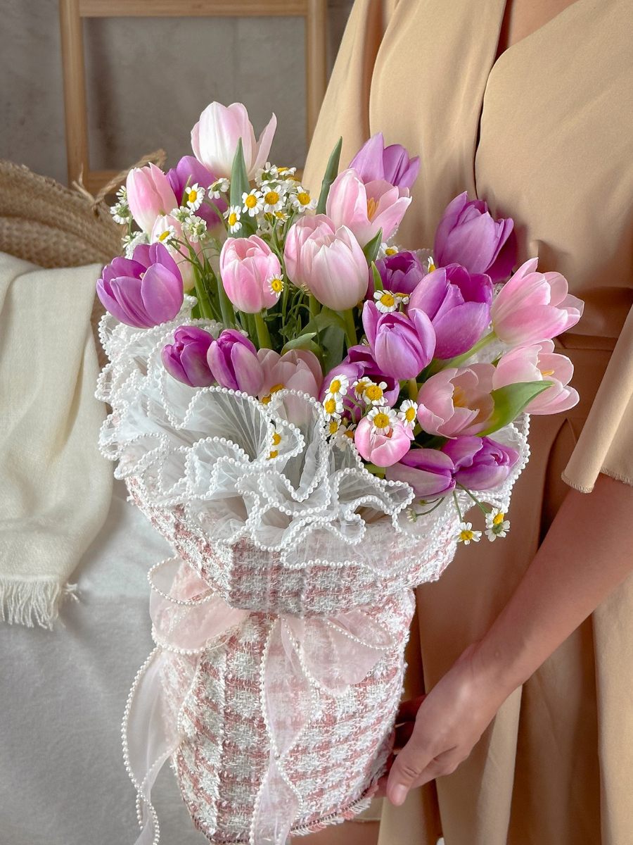 Our premium bouquets, crafted by our skilled florists in our signature design, deliver an elegant look through luxurious bloom and high-quality fillers. Each tulip is carefully selected for its quality and freshness, ensuring a breathtaking display of natural elegance wrapped in a tweed cloth.