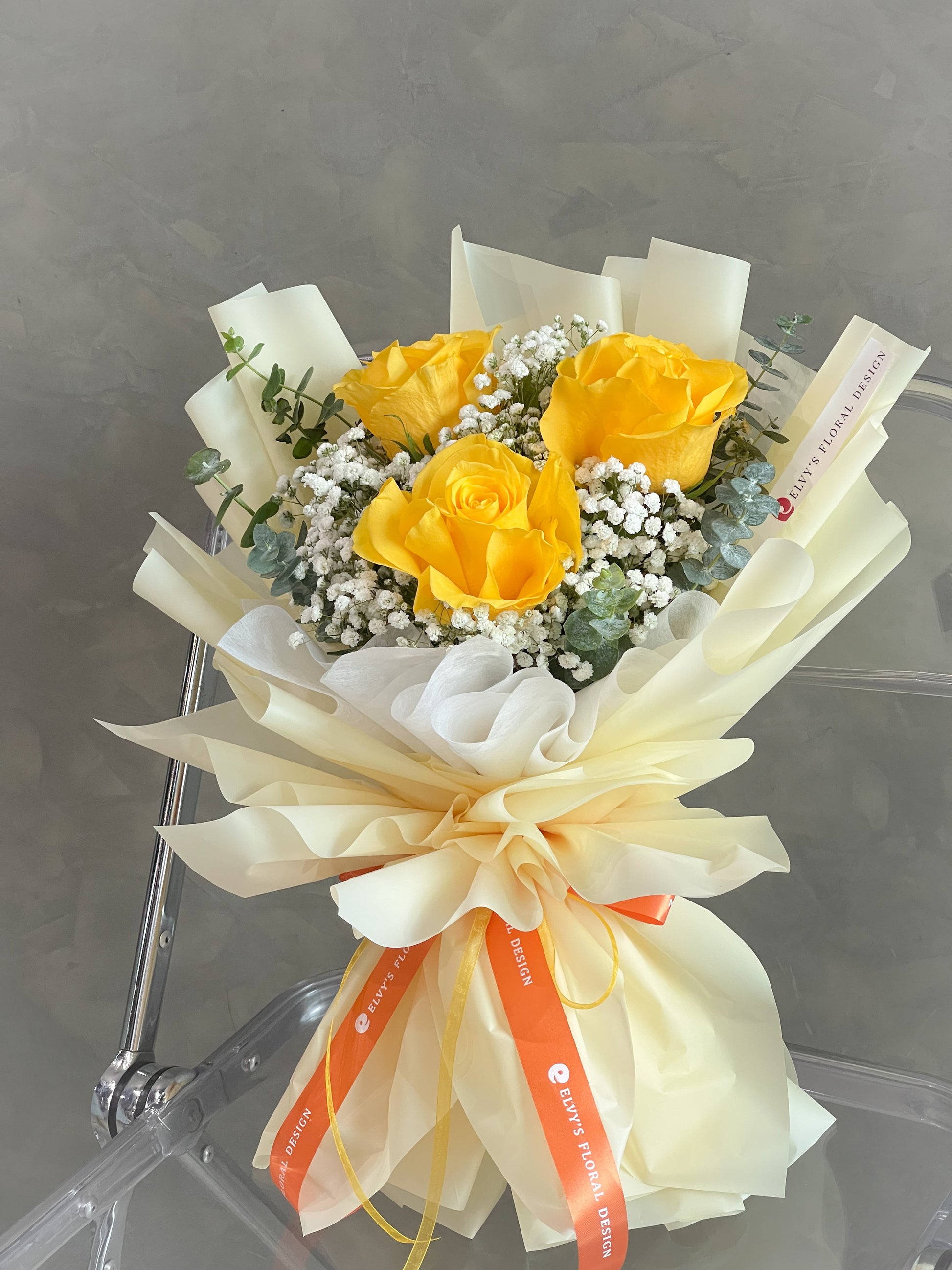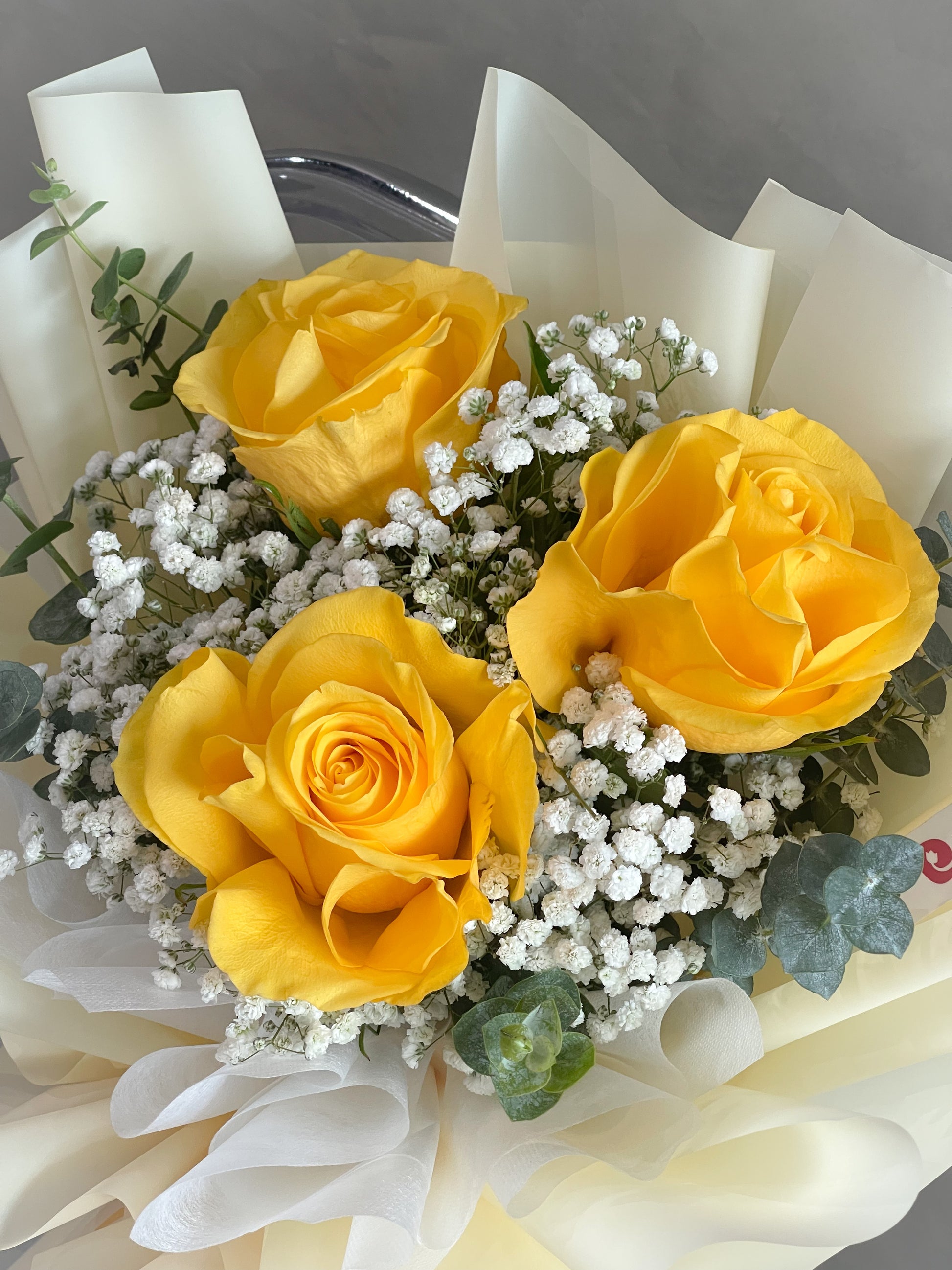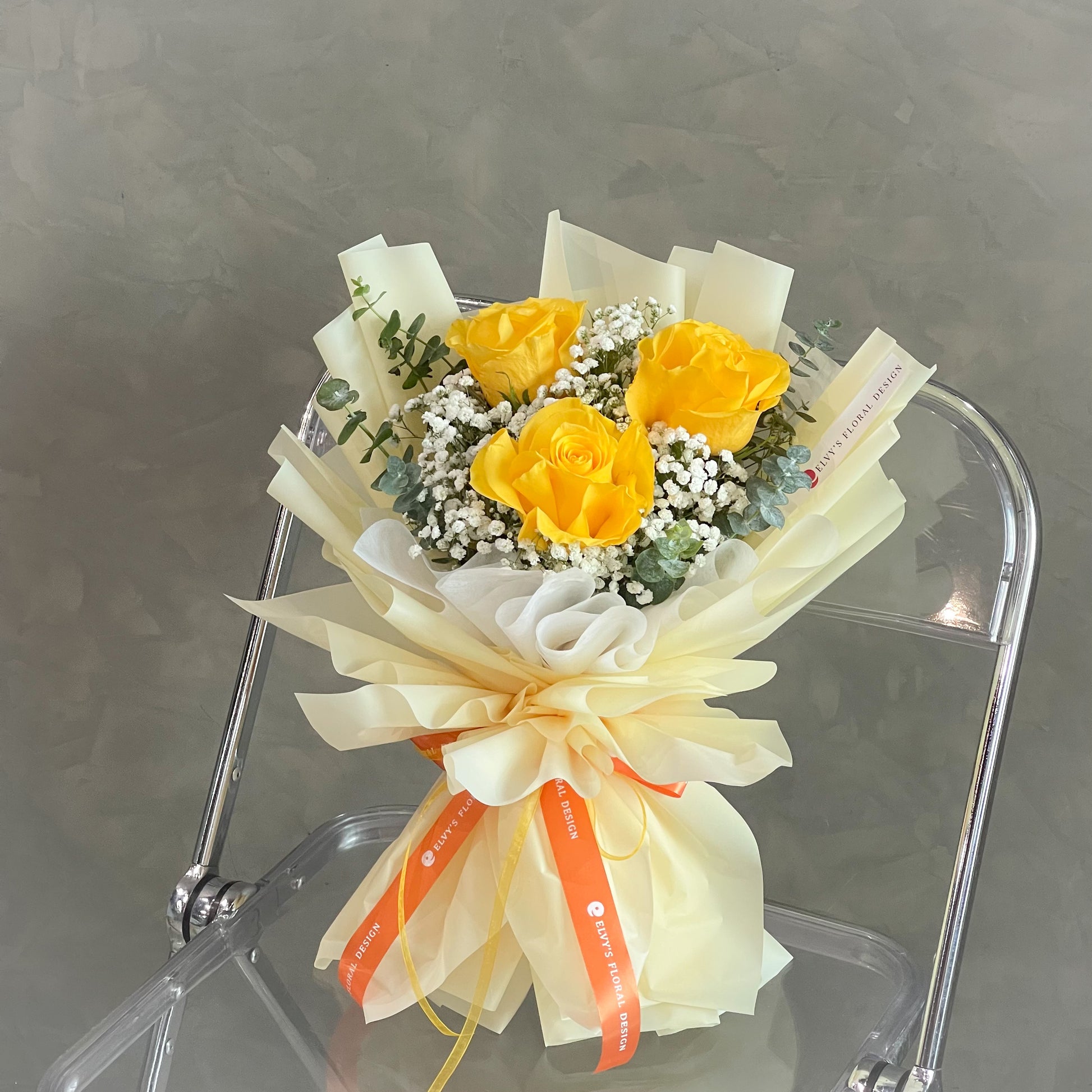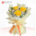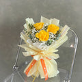 We make sure to highlight smaller bouquets by choosing high-quality flowers in bright yellow and small white flower fillers, balancing them out in an elegant arrangement.