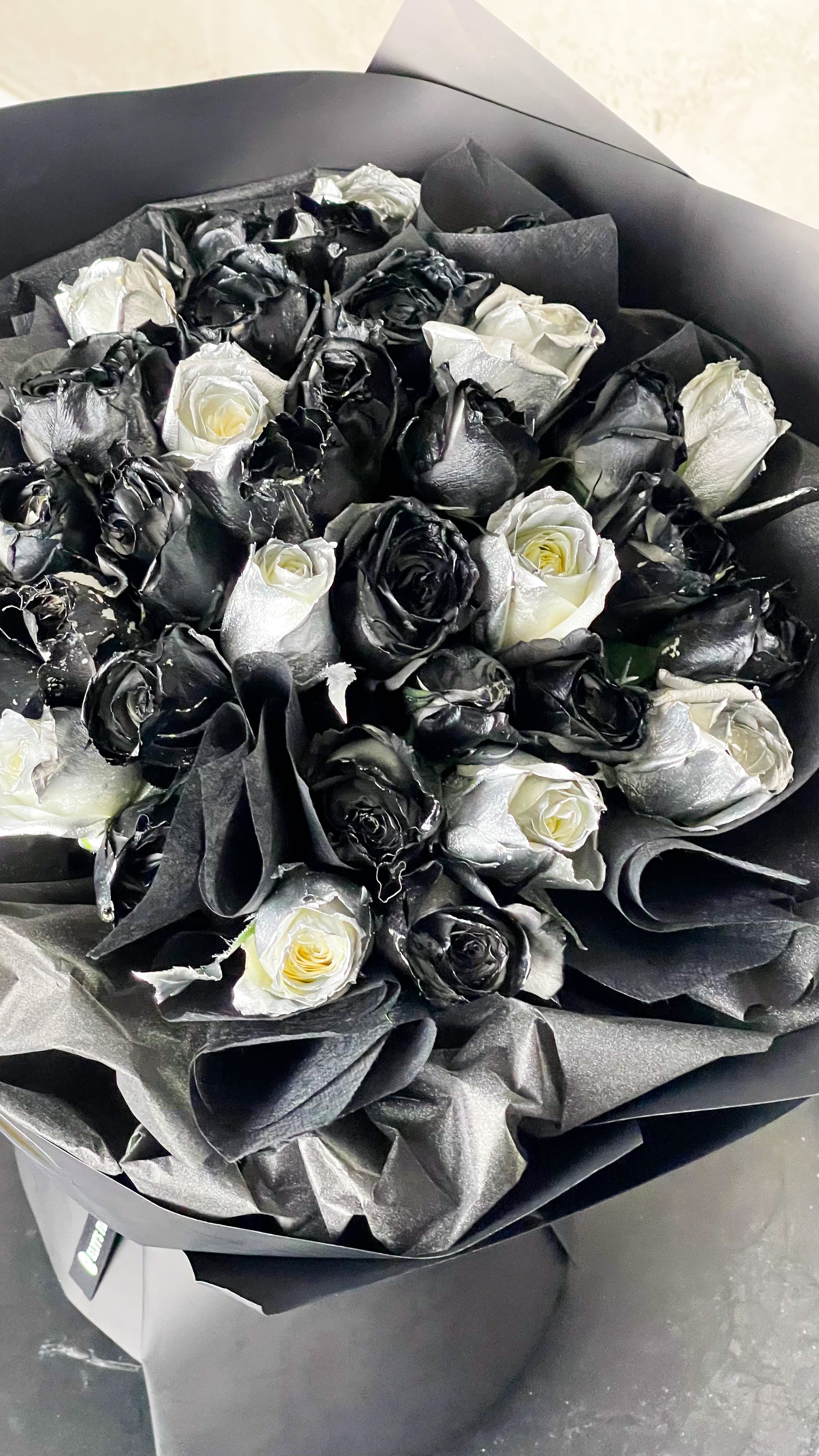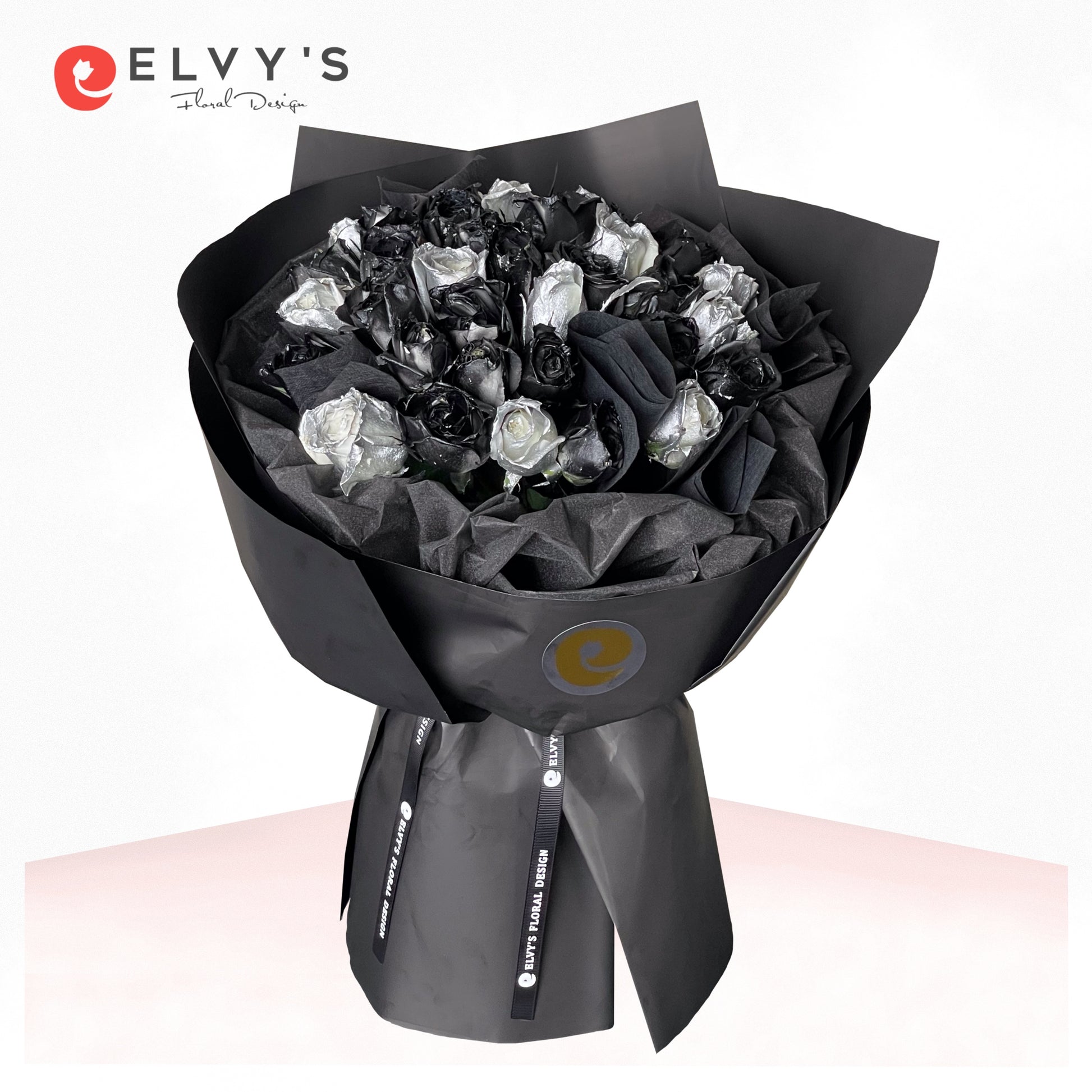 Each rose is carefully selected for its velvety petals in exotic color of black and silver, creating a bouquet that exudes elegance and charm.