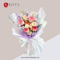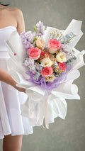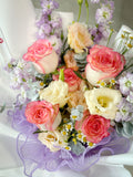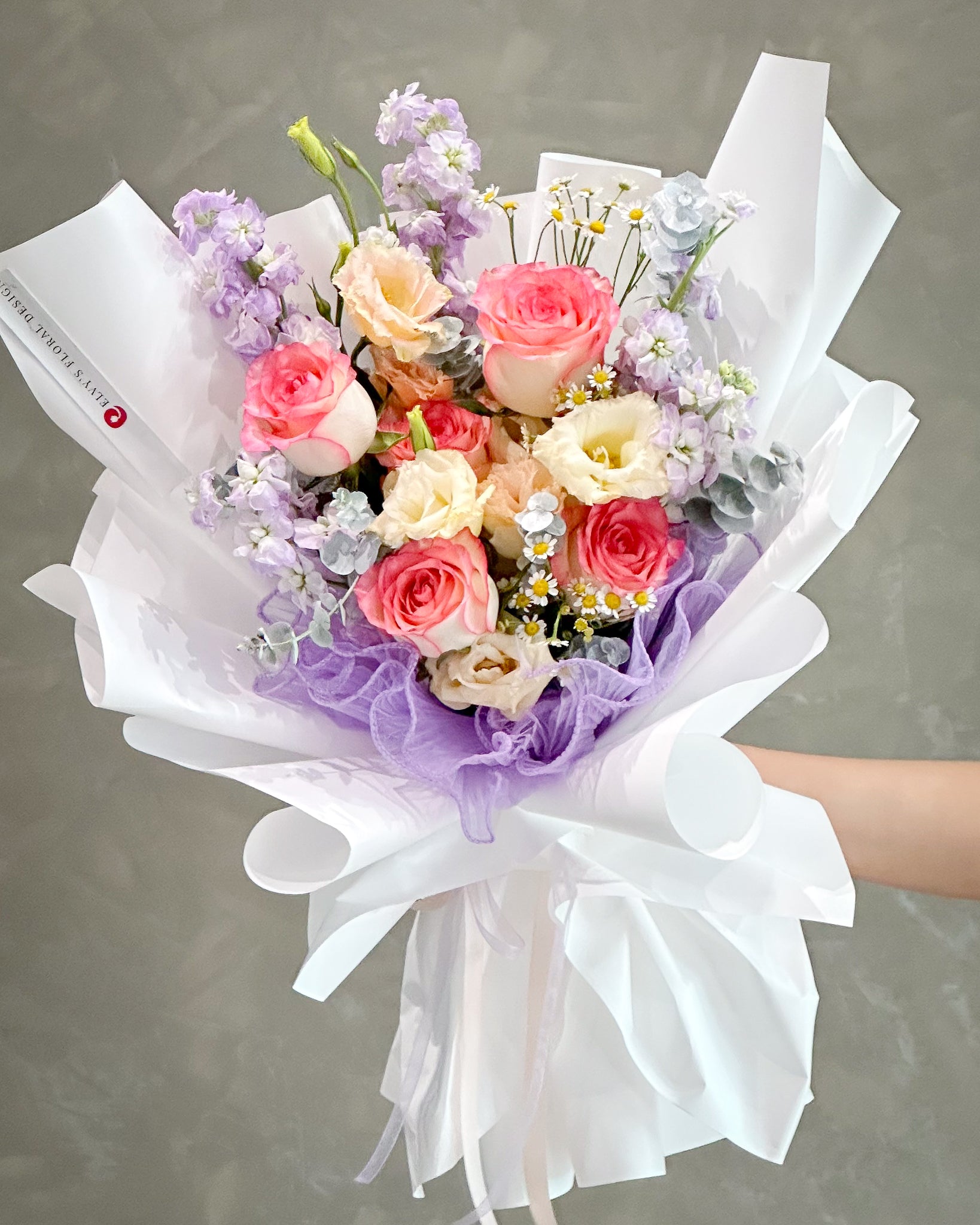 Description: Featuring soft-toned Holland roses, lisianthus, and mattiola, accented by chamomile and fresh eucalyptus, this arrangement embodies elegance and tranquility—a perfect way to express your affection.