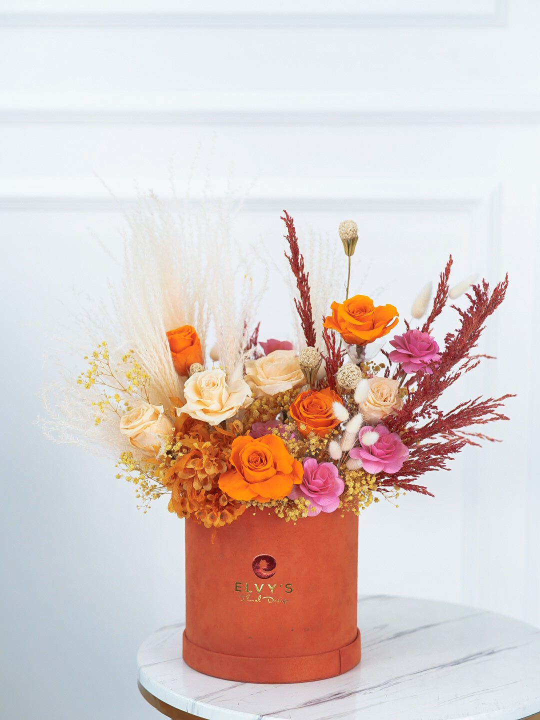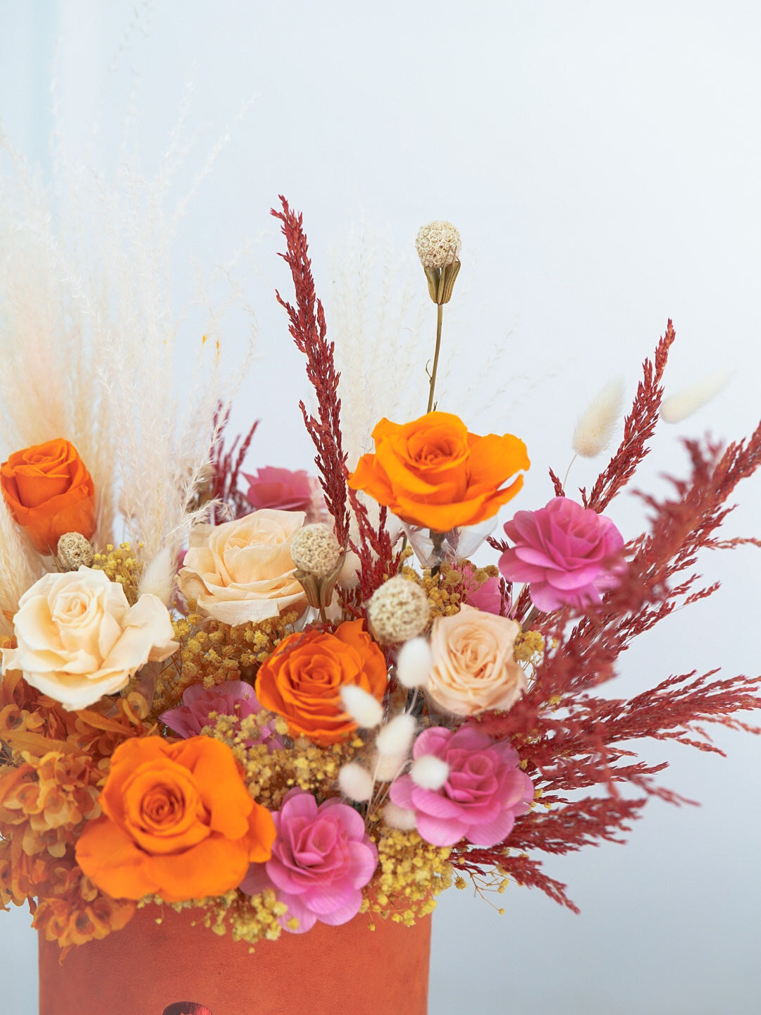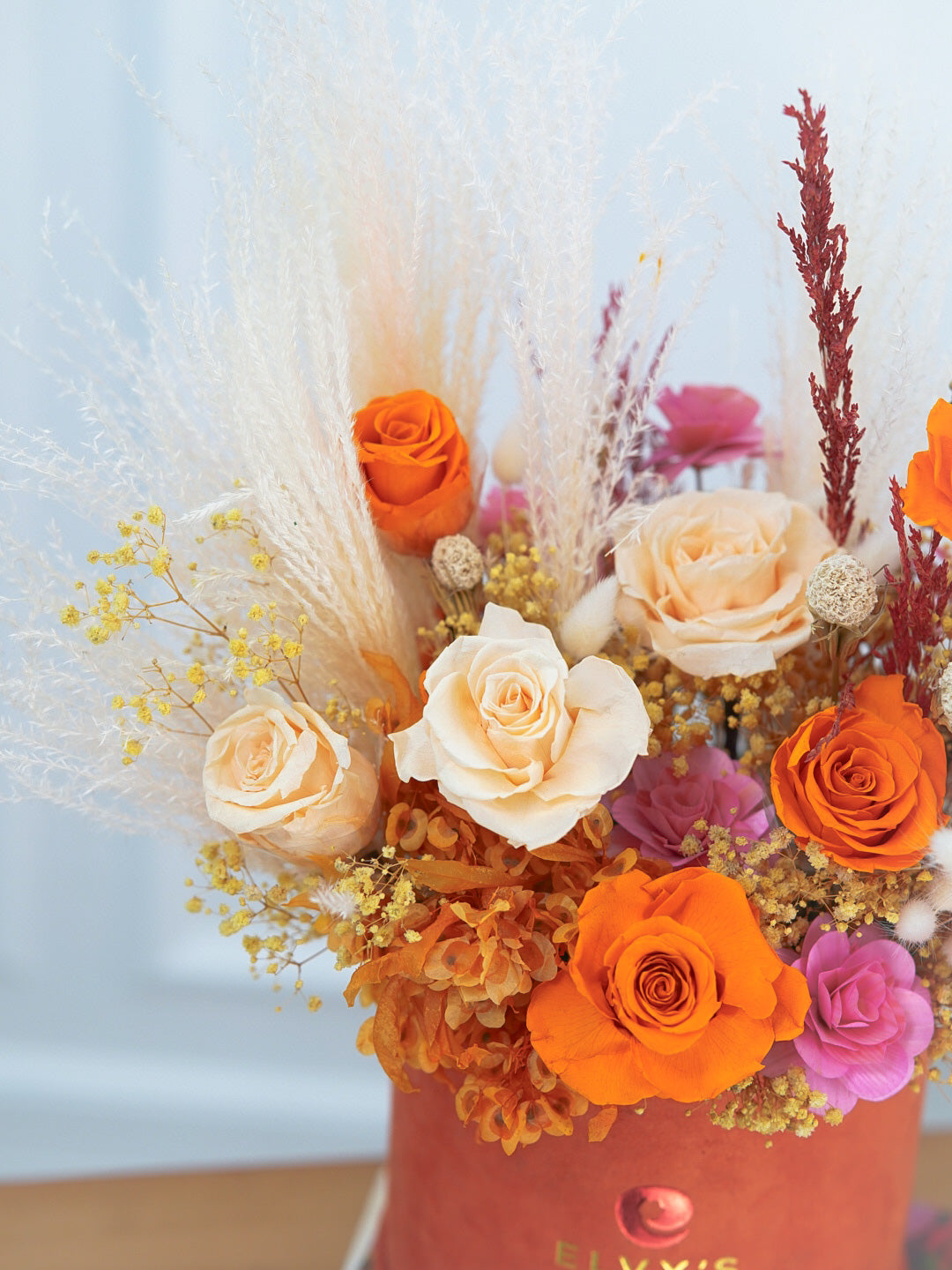 Preserve roses, wood flower, gypsophila, stynx, lagurus, and angel flower.