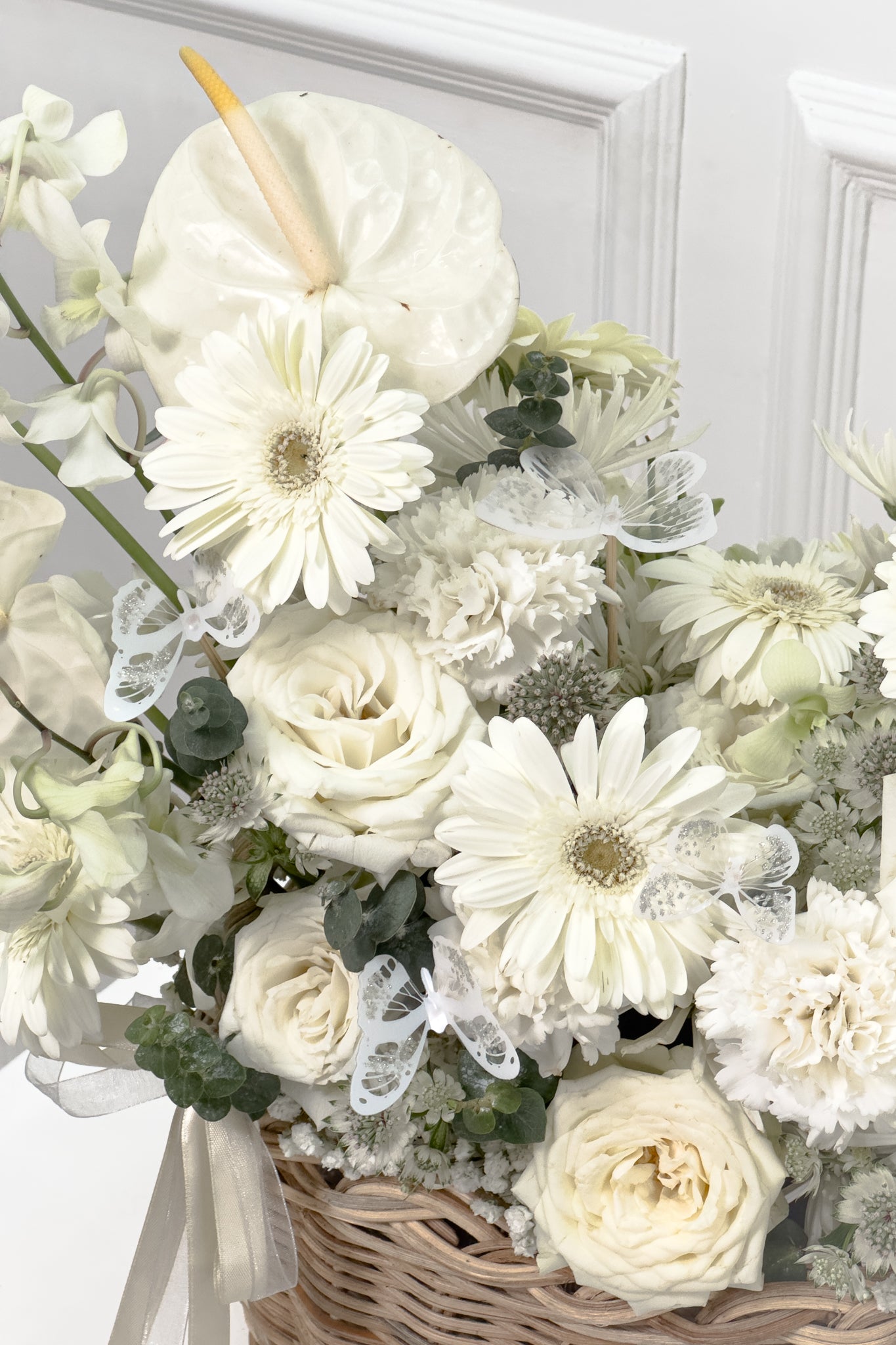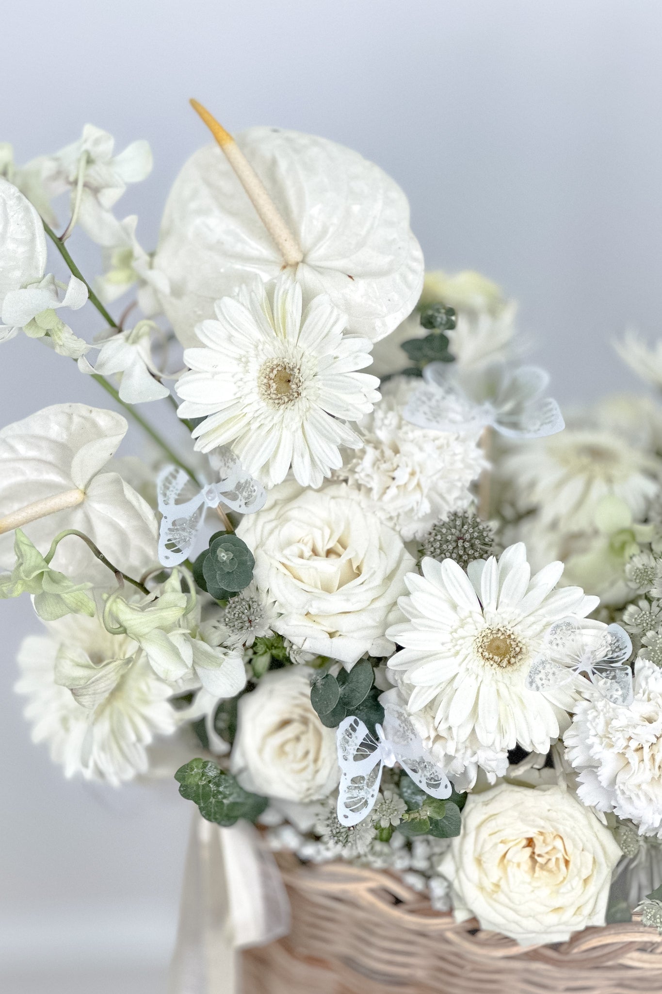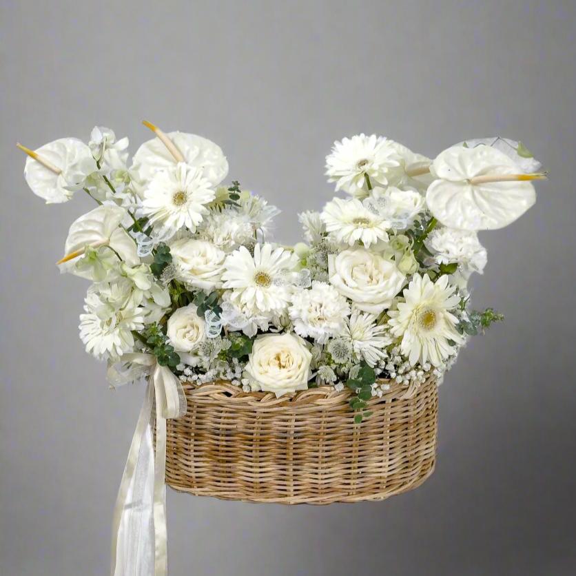 This all-white basket arrangement exudes elegance and serenity, featuring a stunning selection of fresh blooms tightly bound to create an opulent and refined look. The delicate mix of anthuriums, gerberas, roses, carnations, and baby’s breath symbolizes purity, love, and remembrance, making it a beautiful tribute for meaningful moments of reflection.