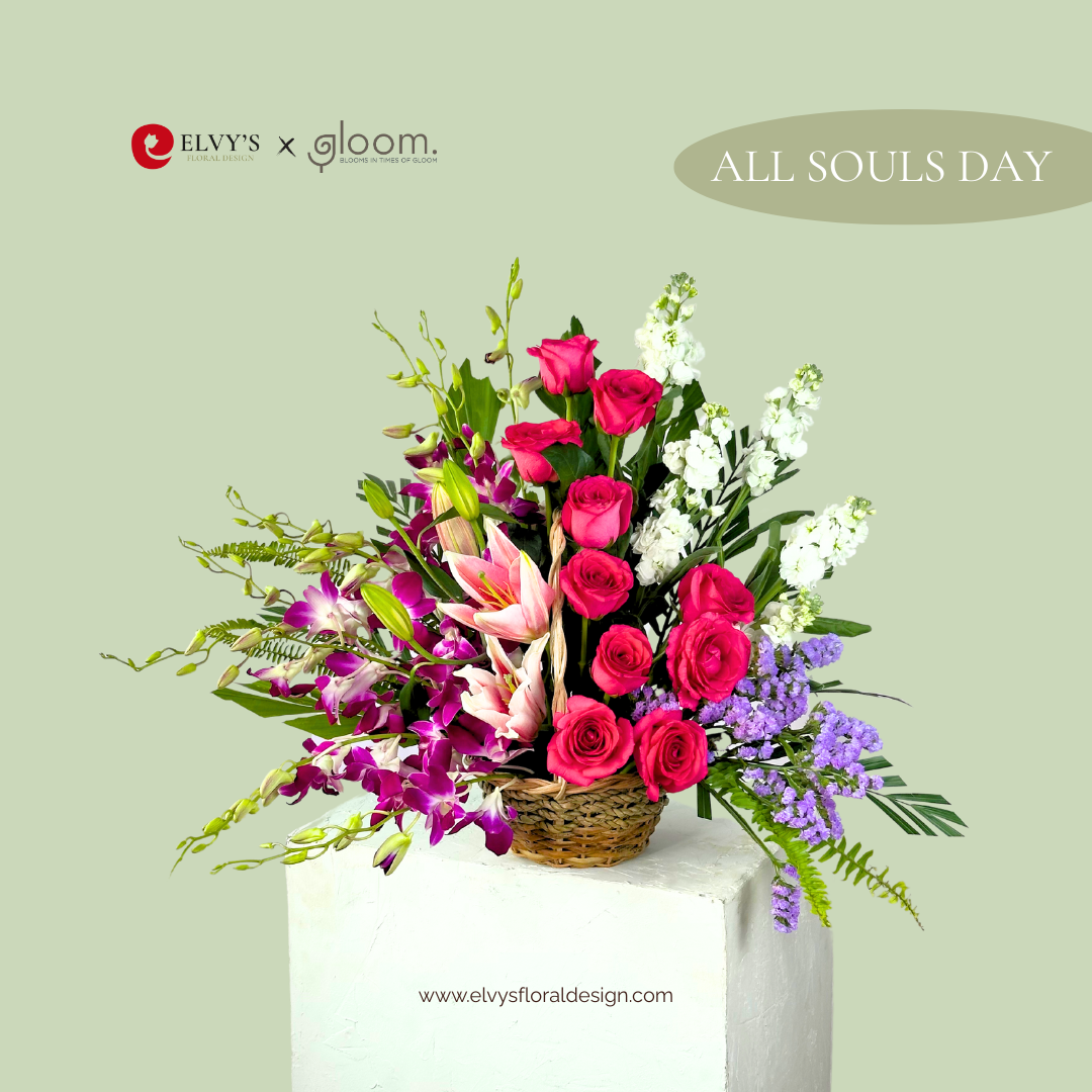 Fuchsia Reverence中的每朵花都经过精心挑选,以唤起深深的荣誉感和纪念感。大胆的紫红色玫瑰搭配柔和优雅的粉色星空,形成鲜明对比,而白色的紫罗兰和兰花则增添了精致感。蕨类植物和补血草的茂盛填充物平衡了设计。这种布置为万灵节提供了完美的致敬,将鲜艳的色彩与爱与尊重的信息融为一体。