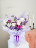 我们的标志性设计由我们技艺精湛的花艺师精心打造,以鲜艳的淡紫色和白色花朵展现现代风格,营造出精致而个性化的布置。