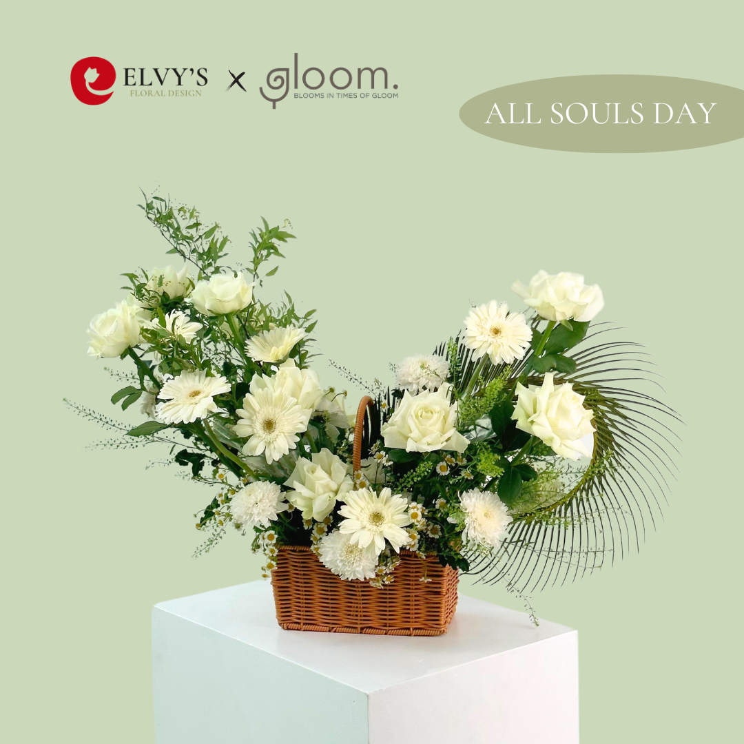 纯净与绿色是一种宁静清新的花束,将白色花朵的永恒之美与郁郁葱葱的绿色植物相结合。清爽的白玫瑰、非洲菊和菊花唤起了一种纯洁的感觉,而洋甘菊和热带树叶则增添了质感和深度。层叠的绿色植物提供了自然而平衡的流动,使这款花篮花束成为万灵节以优雅和简约的方式向亲人致敬的完美礼物。